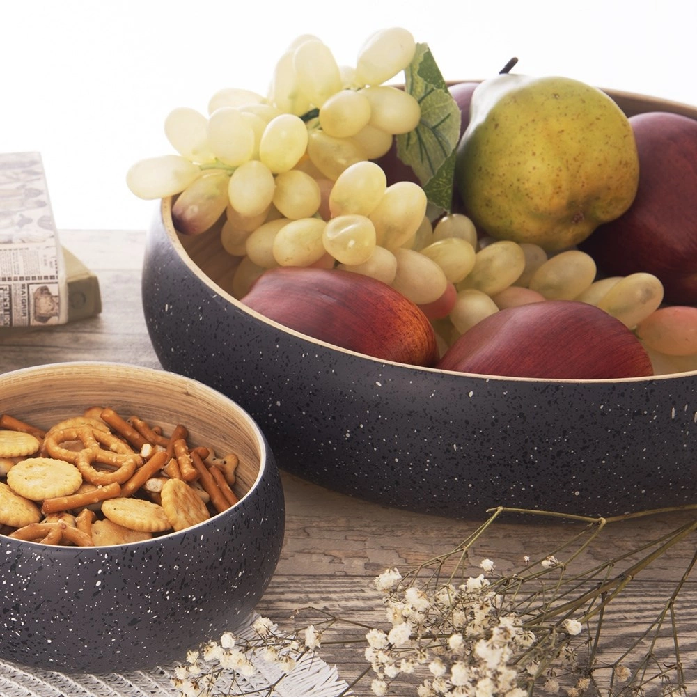 Elegante bamboe kom met een inhoud van 4 l en een diameter van 30 cm, met een buitenzijde in granietgrijs design. Ideaal voor salades, fruit en snacks, handgemaakt, hittebestendig tot 40 °C en perfect passend bij zowel een modern als natuurlijk tafelservies.