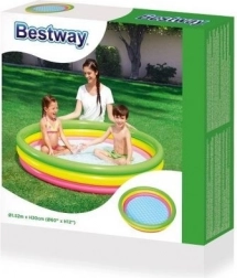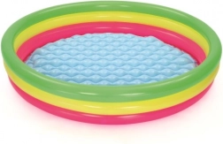 Het ronde zwembadje in regenboogkleuren van duurzaam vinyl biedt comfort en zekerheid bij de waterpret van kinderen. De zachte, opblaasbare en getextureerde bodem dempt stappen en isoleert tegen de kou van de grond, waardoor het ideaal is voor zowel het gazon als het terras. Drie afzonderlijk opblaasbare ringen behouden de vorm en verhogen de stabiliteit van de constructie.