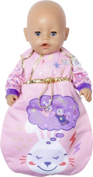 Gun je pop een ontspannen dutje in de zachte BABY BORN Happy Birthday-slaapzak. De stijlvolle galactische print met zon, maan, sterren en feestelijke motieven, aangevuld met gouden biezen, valt meteen op en past prachtig bij de verjaardagseditie.