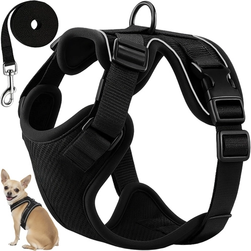 Het harnas is snel en eenvoudig aan en uit te doen, banden met soepele verstelling maken een nauwkeurige afstelling mogelijk voor het lichaam van een kleine hond of kat. Bijgevoegd is een lijn van 150 cm, die voldoende bewegingsvrijheid biedt met behoud van controle.