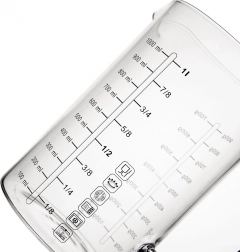 De schalen zijn goed leesbaar en maken snel en betrouwbaar afmeten mogelijk. Je vindt er maatverdeling voor vloeistoffen in ml (100–1000 ml) en in liters (1/8 l – 1 l), evenals omrekentabellen voor meel (100–700 g) en suiker (100–900 g). De maximaal aangegeven capaciteit is 1 l, het werkelijke volume van de kan is tot 1,2 l.