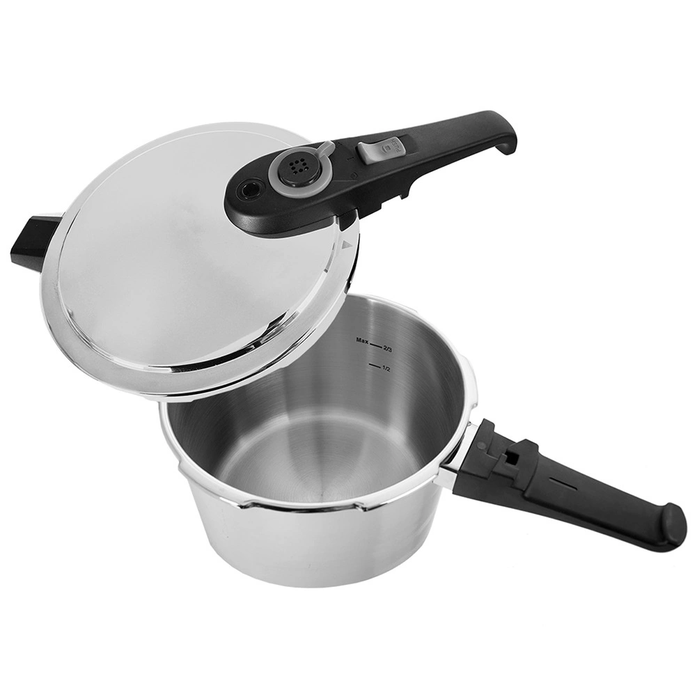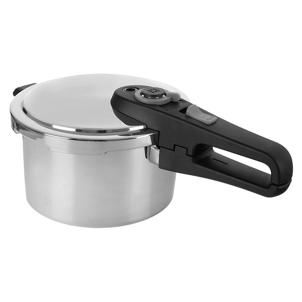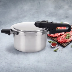 Praktische snelkookpan met een totale inhoud van 4 l, met comfortabel automatisch sluiten en drukregeling voor snel en energiezuinig koken. Gemaakt van hoogwaardig roestvrij staal met een sandwichbodem voor een gelijkmatige warmteverdeling. Biedt 2 kookprogramma’s, een veiligheidsventiel en een programma voor het vrijlaten van stoom. Geschikt voor alle soorten kookplaten, inclusief inductie, en vaatwasserbestendig (zonder deksel).
