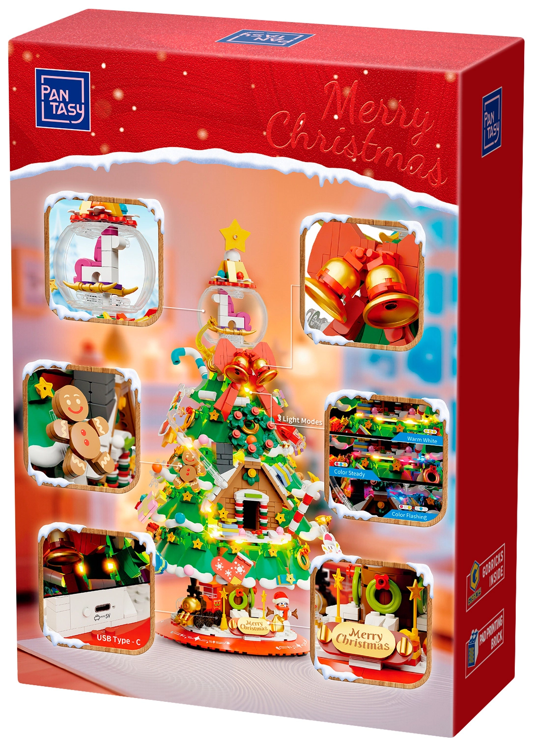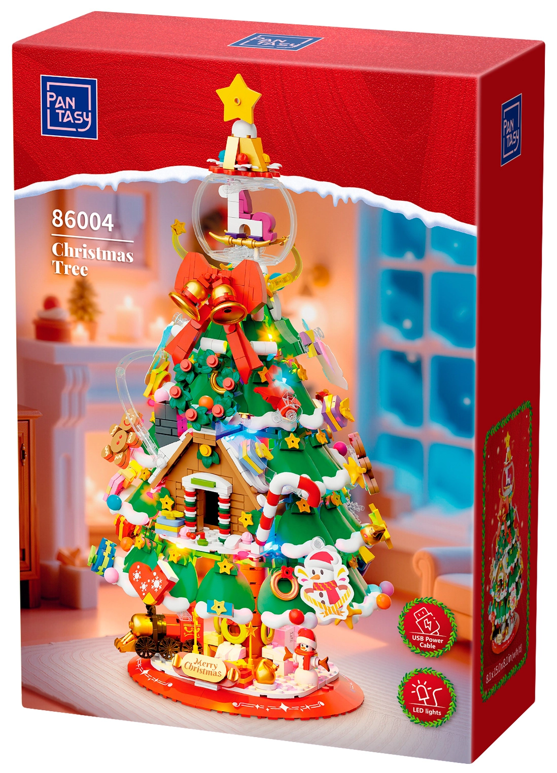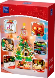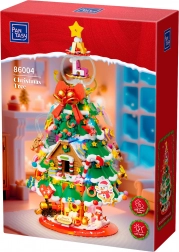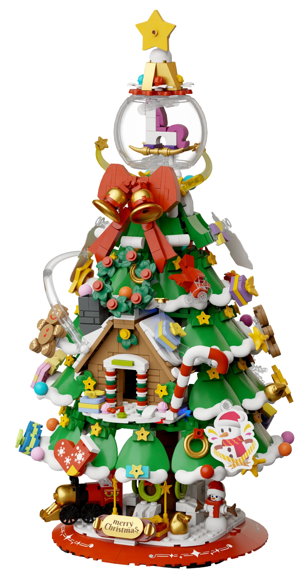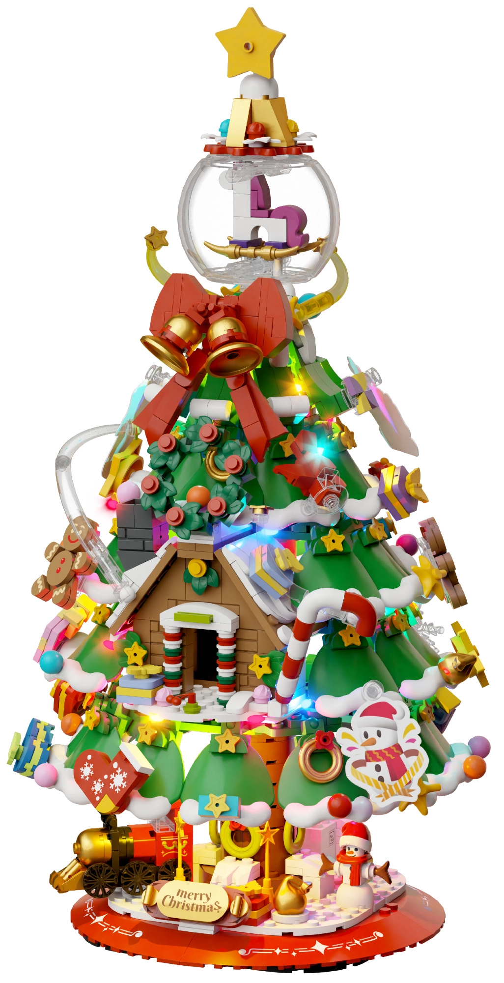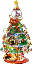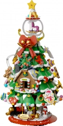 Deze elegante kerstboom van bouwsteentjes wordt de blikvanger op de feesttafel en in de woonkamer. Hij bevat betoverende details zoals een mini-treintje, sneeuwpop, peperkoekhuisje, belletjes en een peperkoekmannetje. Bovenop schittert een kristallen bol met schommelpaard, inclusief transparante kap voor bescherming en een fraai effect.