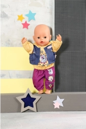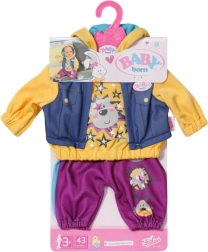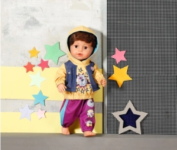 Stijlvolle streetwear van BABY born voor poppen van 43 cm met een 2-in-1 hoodie met capuchon en een bodywarmer in denimlook en comfortabele joggingbroek in braambessenkleur. Vrolijke dieren- en sterrenprints stimuleren de fantasie en langdurig speelplezier, aankleden is eenvoudig dankzij de hoogwaardige afwerking en in de set zit ook een praktische hanger.