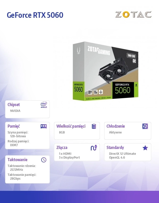 De compacte grafische kaart ZOTAC GAMING GeForce RTX 5060 Twin Edge OC levert next-gen prestaties met de NVIDIA Blackwell-architectuur, ondersteuning voor DLSS 4 en snel 8 GB GDDR7-geheugen. Dankzij de fabrieksoverklok en dubbele actieve koeling biedt hij soepele gameplay in moderne titels, hoge efficiëntie en een uitstekende verhouding tussen prestaties en afmetingen.