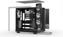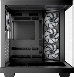 Het ruimte-efficiënte interieur ondersteunt een radiator tot 360 mm, een ATX-moederbord en een GPU tot ca. 400 mm. Slimme drive-brackets maken het mogelijk om gelijktijdig 1× HDD en 2× SSD te monteren zonder ruimteverlies achter de tray. Twee mogelijke posities voor de voeding vergemakkelijken builds met aansluitingen aan de achterzijde (ASUS BTF, MSI Project Zero, Gigabyte Project Stealth). Stofilters aan de zijkant en onderzijde zorgen voor eenvoudig onderhoud en een schone werking.