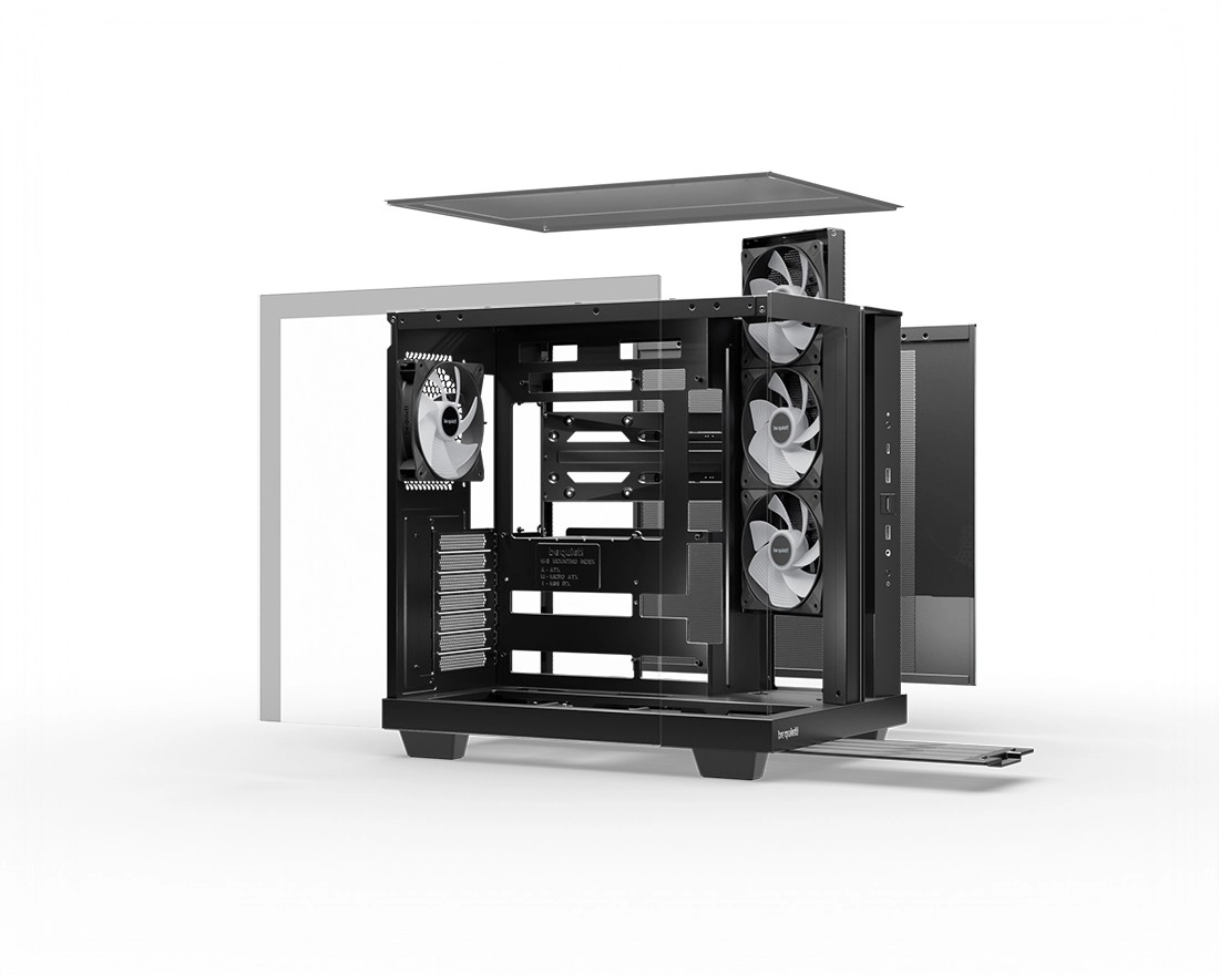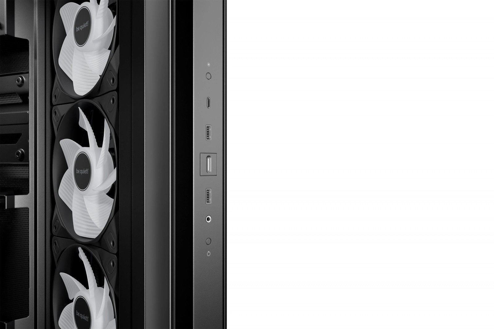 Vier Light Wings LX 120 mm PWM (achter + zij met omgekeerde bladen) leveren een hoge luchtstroom en indrukwekkende ARGB-verlichting met 16 LED’s in de rotornaaf. De geïntegreerde ARGB-knop in het I/O-paneel biedt voorgeprogrammeerde effecten en kleuren, terwijl de meegeleverde 6-kanaals ARGB/PWM-hub nog 4 vrije poorten overlaat voor extra apparaten.