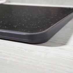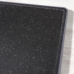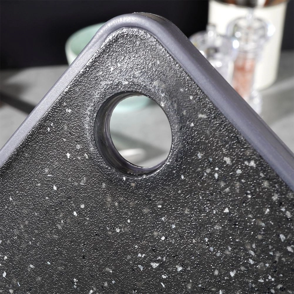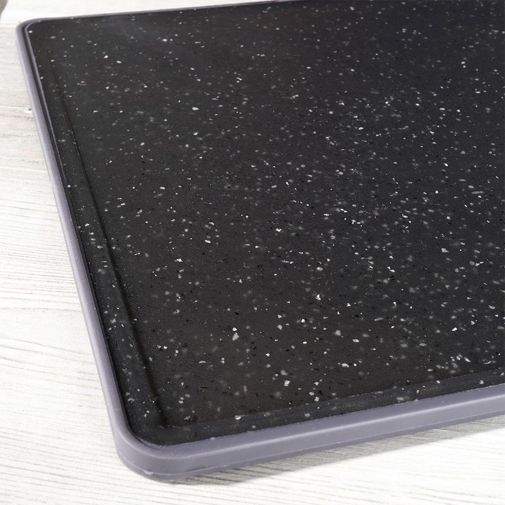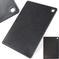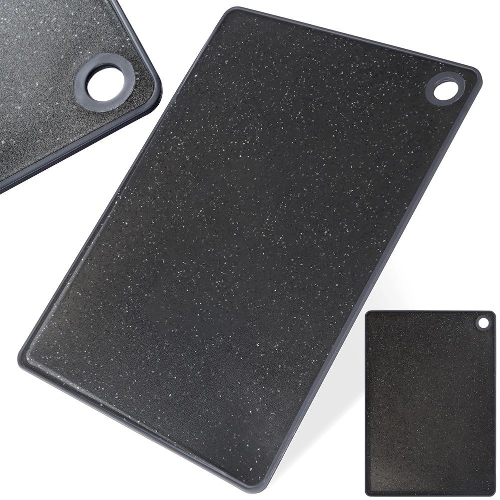 Praktische en stijlvolle snijplank van hoogwaardige kunststof met een oppervlak dat zwart graniet imiteert, ideaal voor het snijden van fruit, groenten en vlees. Dankzij het niet-poreuze materiaal absorbeert hij geen geuren of vloeistoffen en helpt hij het aanrecht schoon en krasvrij te houden.