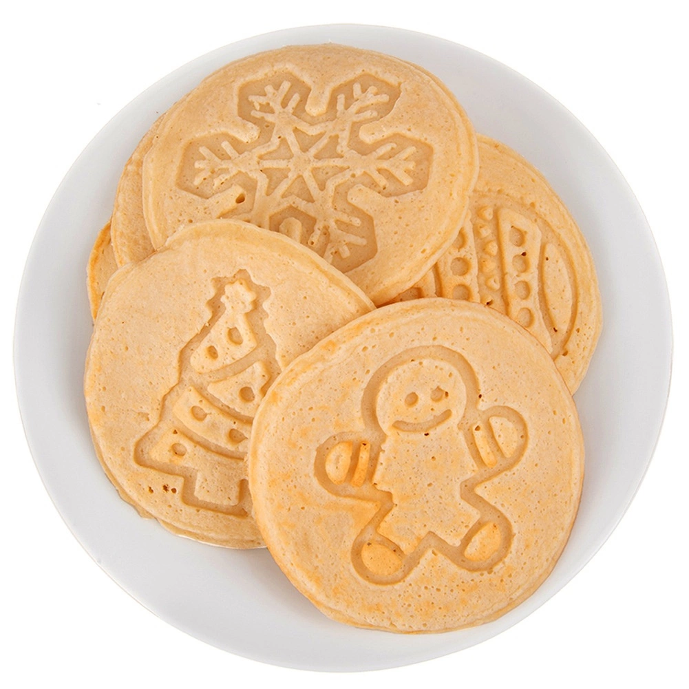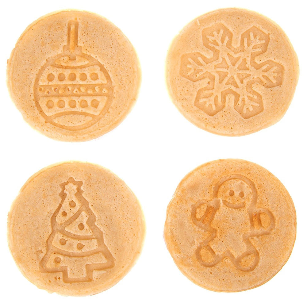 Vier ronde vormpjes met reliëf van een kerstbal, boompje, peperkoekmannetje en sneeuwvlok creëren speelse porties pannenkoekjes en eieren – ideaal voor kinderen en feestelijke tafelmomenten.