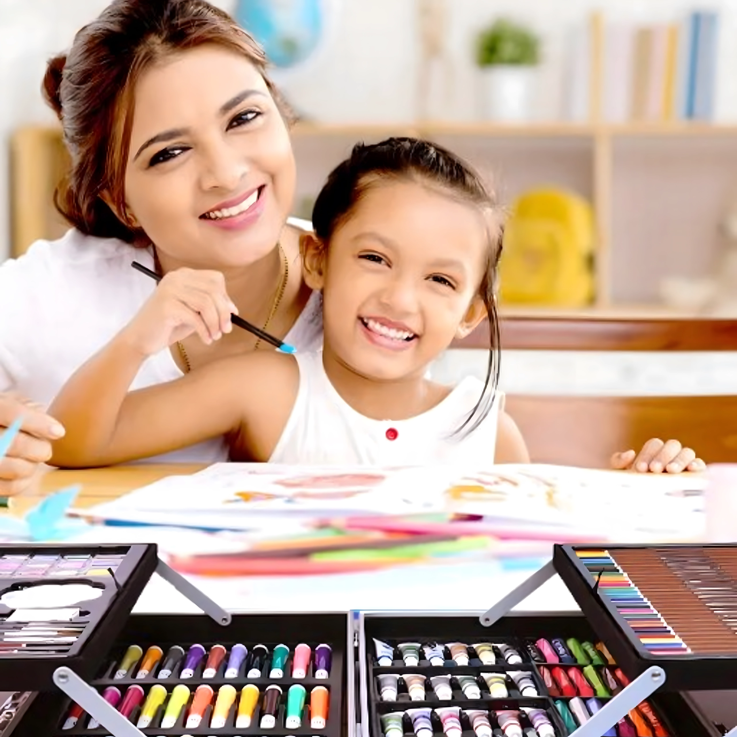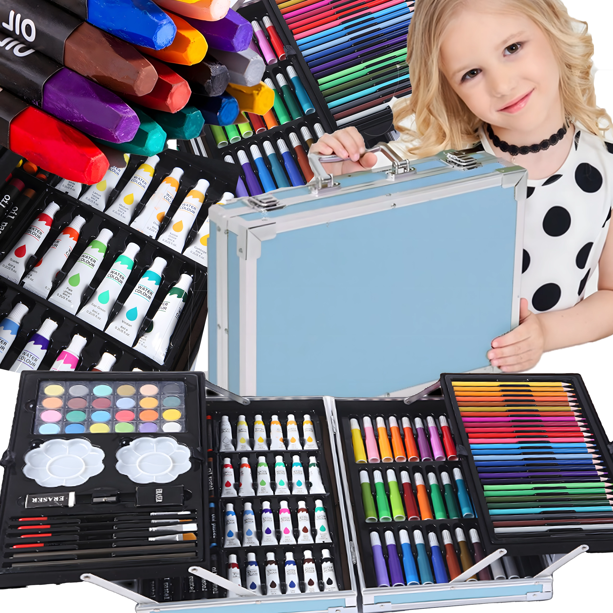 De set combineert kleurpotloden, stiften, waskrijtjes, oliepastels, aquarellen, penselen, paletten en accessoires. Kinderen hebben altijd het juiste hulpmiddel bij de hand voor elk idee.