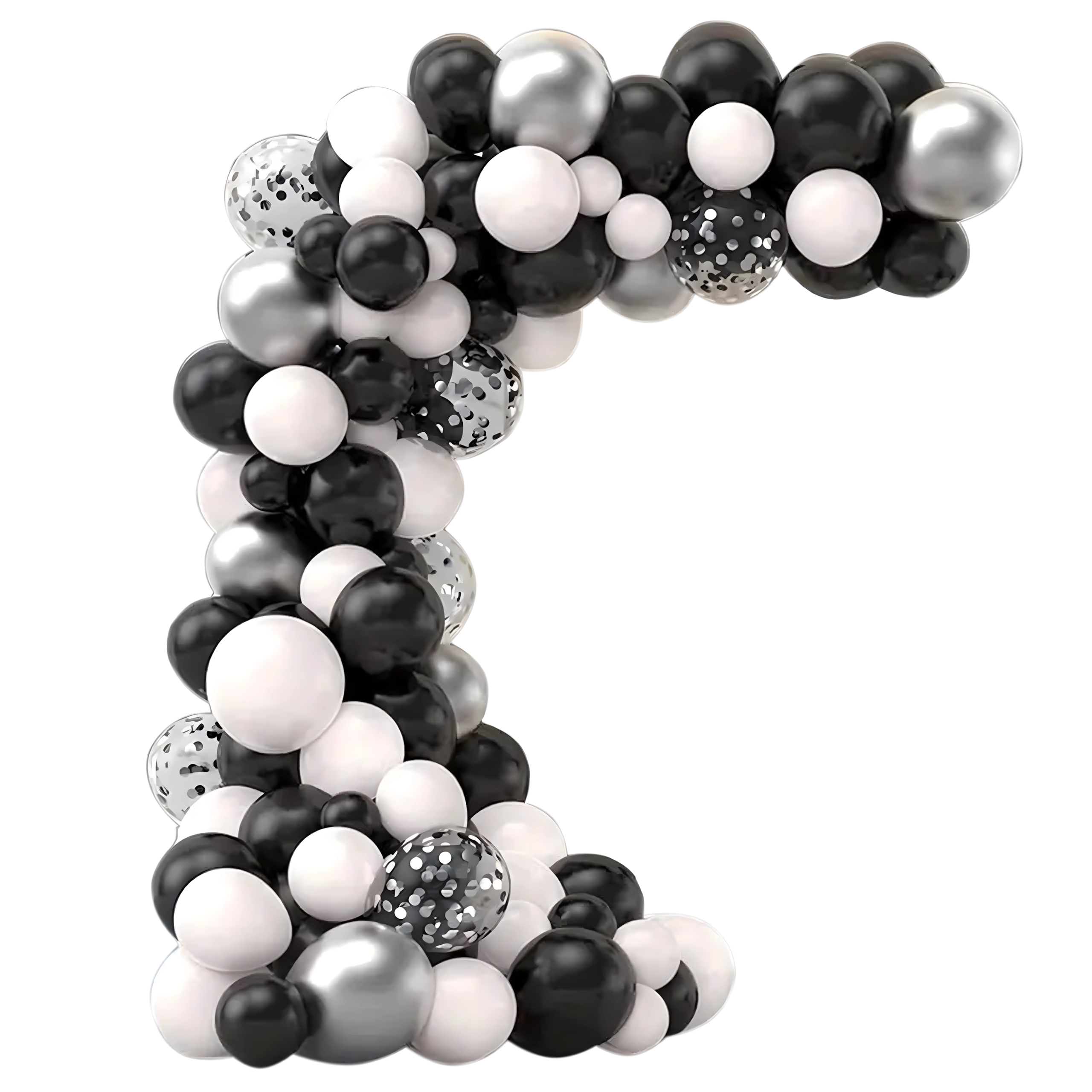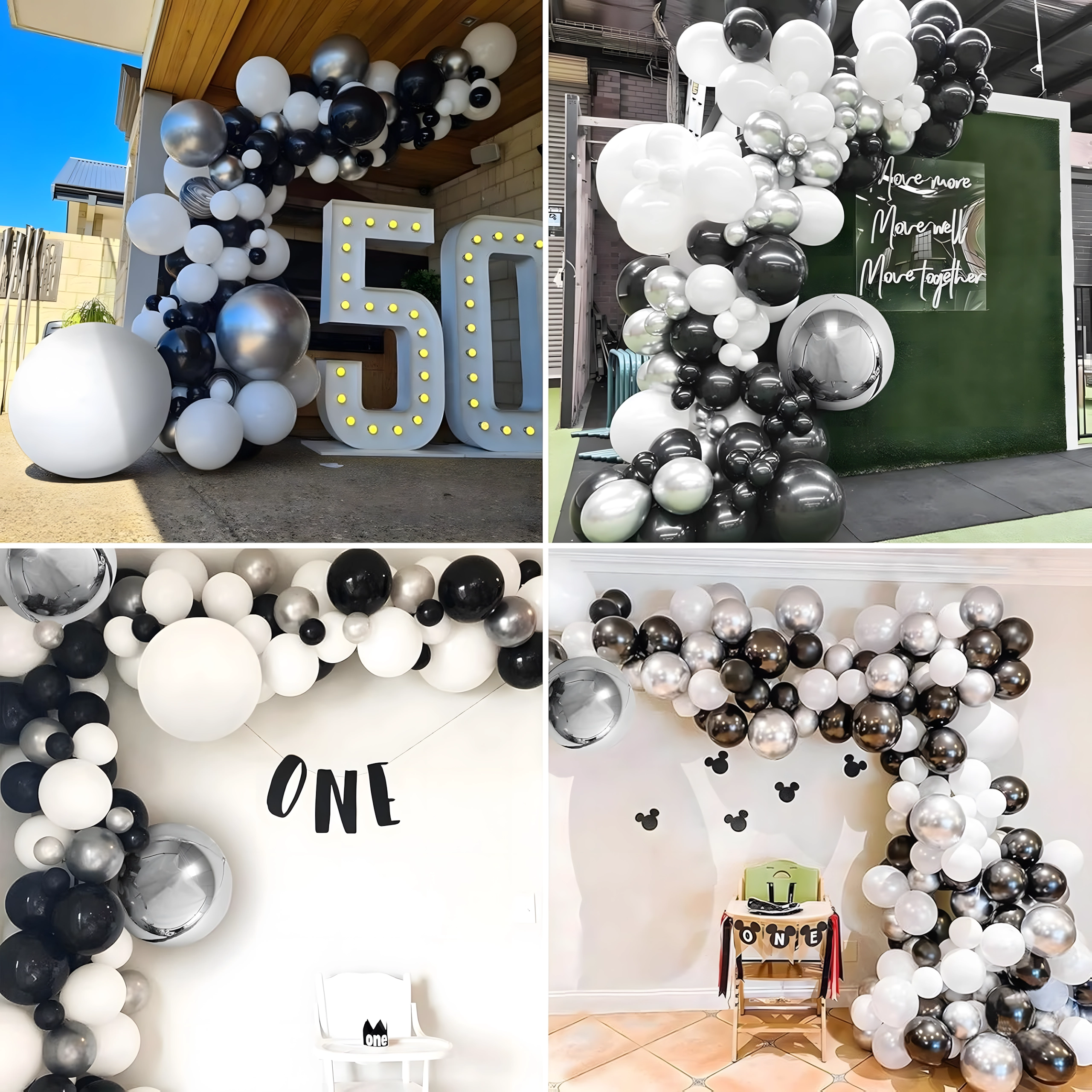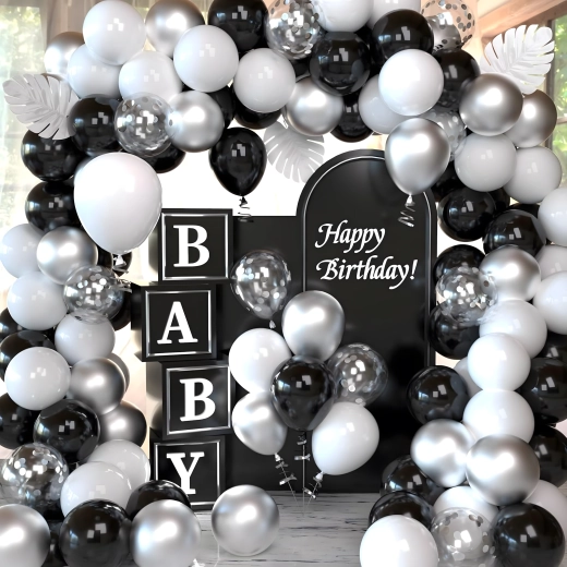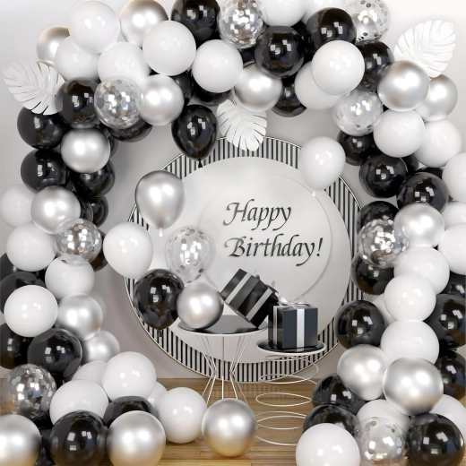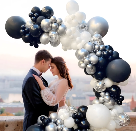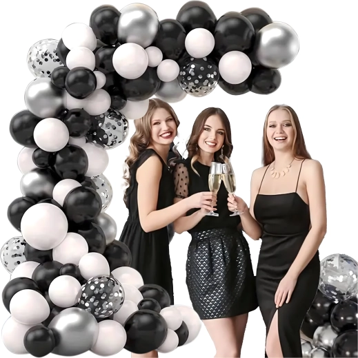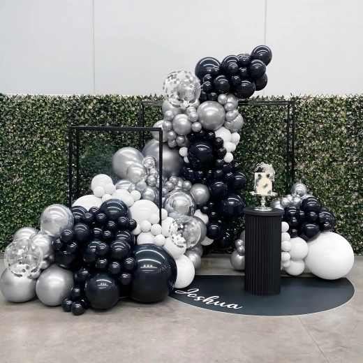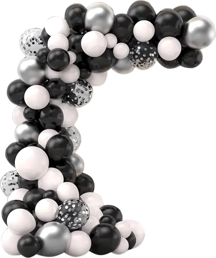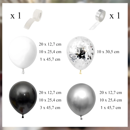 Deze elegante ballonnenslinger in een moderne zwart‑zilver‑witte kleurcombinatie geeft je feest een extra bijzondere uitstraling. Ook beginners kunnen hem eenvoudig samenstellen, met als resultaat een opvallende decoratie die perfect past als entreeboog, achtergrond achter een sweet table of voor een fotohokje.
