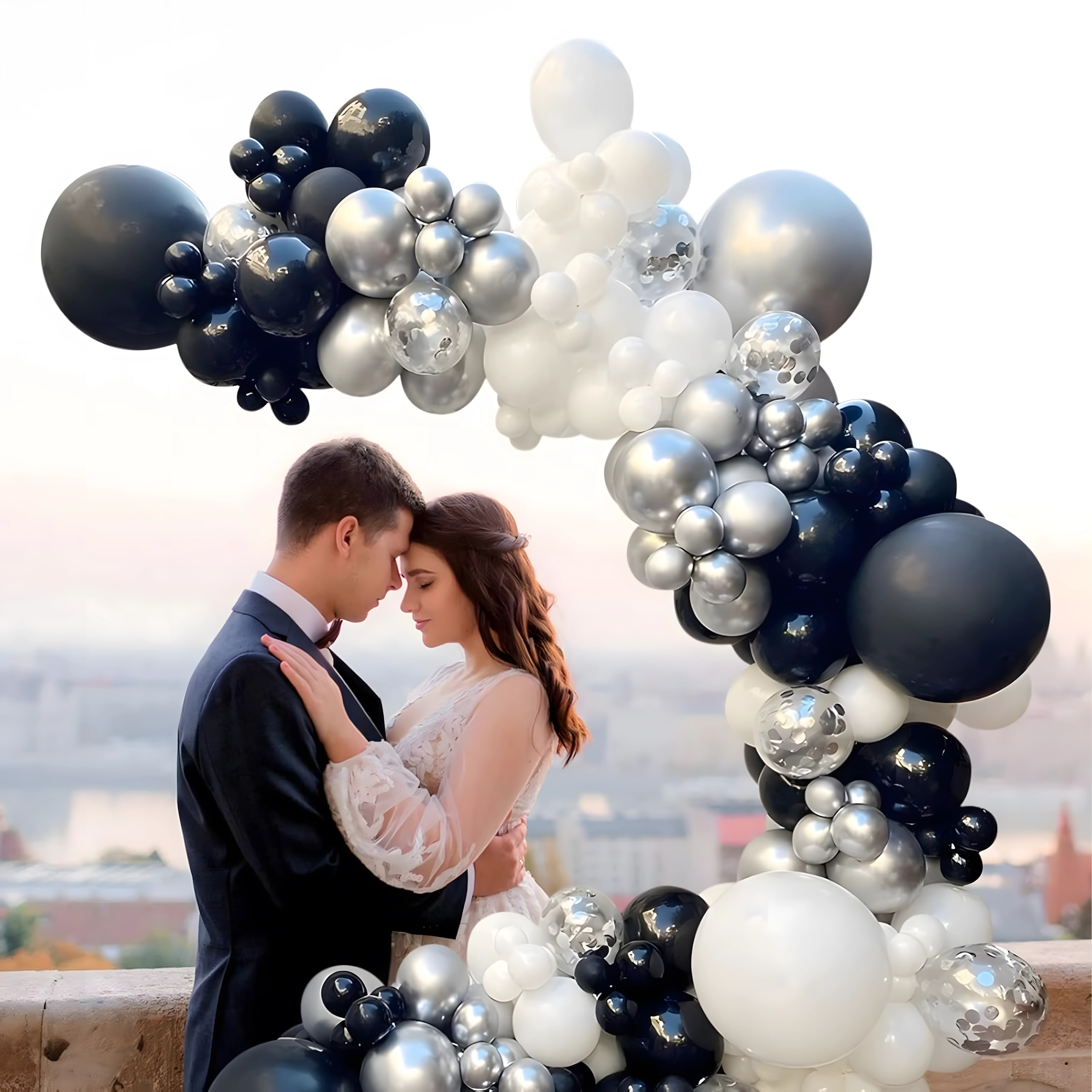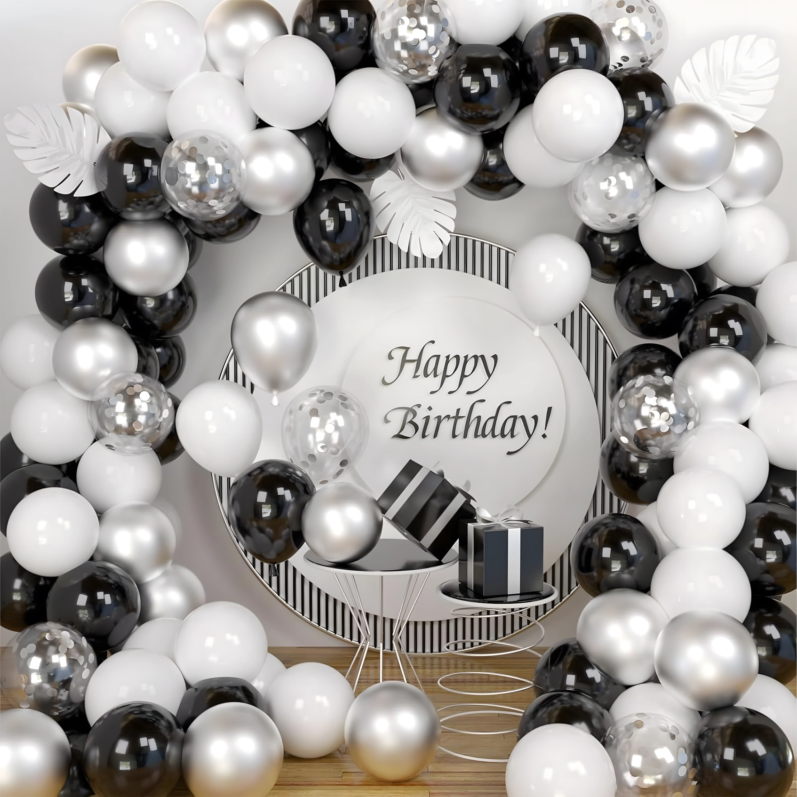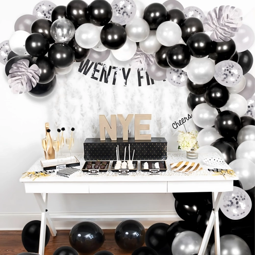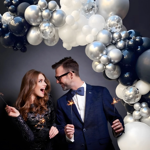 Stijlvolle ballonnenslinger in een combinatie van zwart, zilver en wit voor verjaardagen, bruiloften, oud en nieuw en evenementen. Eenvoudige montage, effectvolle kleuren en het perfecte fotodecor voor ieder feest.