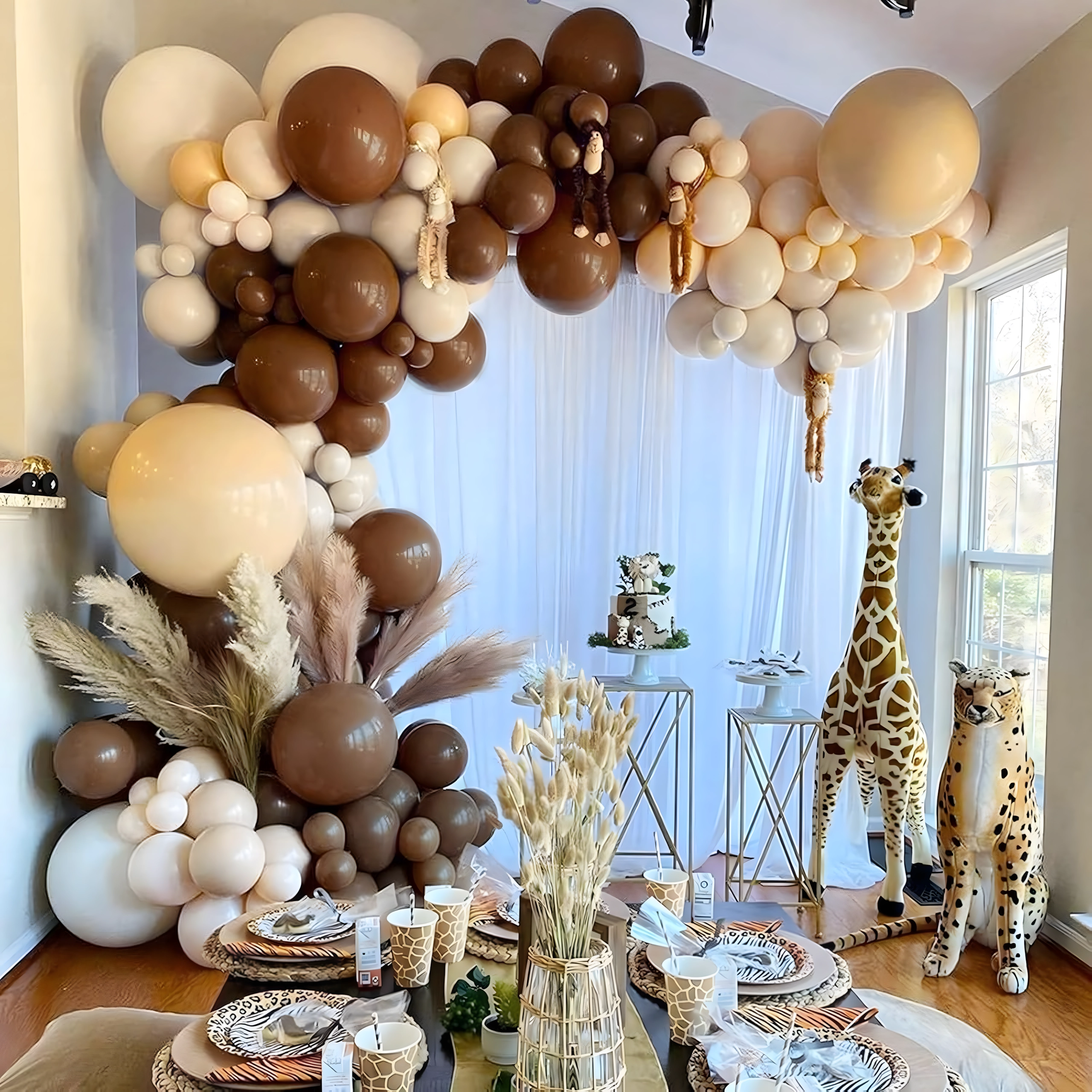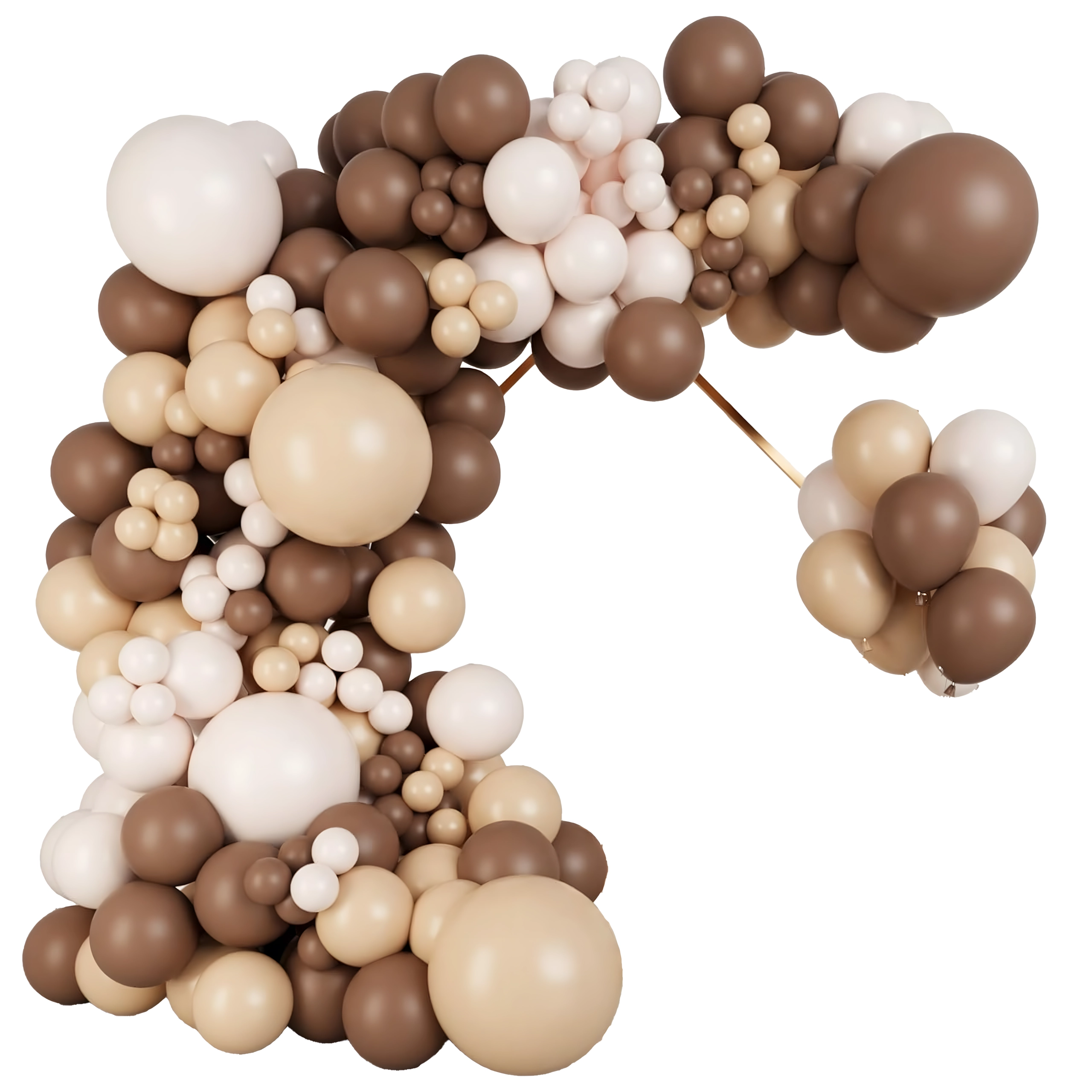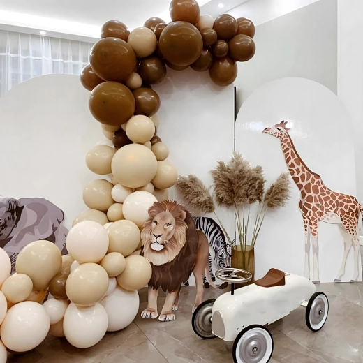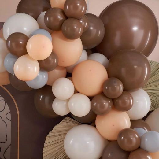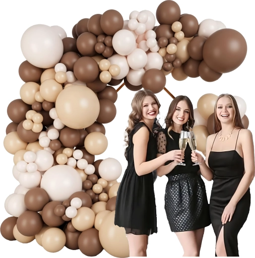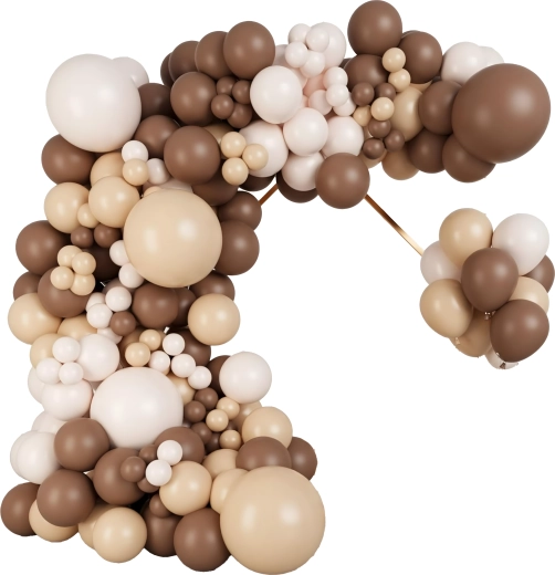 Stijlvolle ballonkrans in tinten bruin en goud die elke viering een vleugje luxe geeft. Bevat 141 onderdelen en is ideaal voor verjaardagen, bruiloften, oudejaarsavond en andere events. Dankzij de eenvoudige montage creëer je snel een indrukwekkende decoratie en een perfecte fotobackdrop.