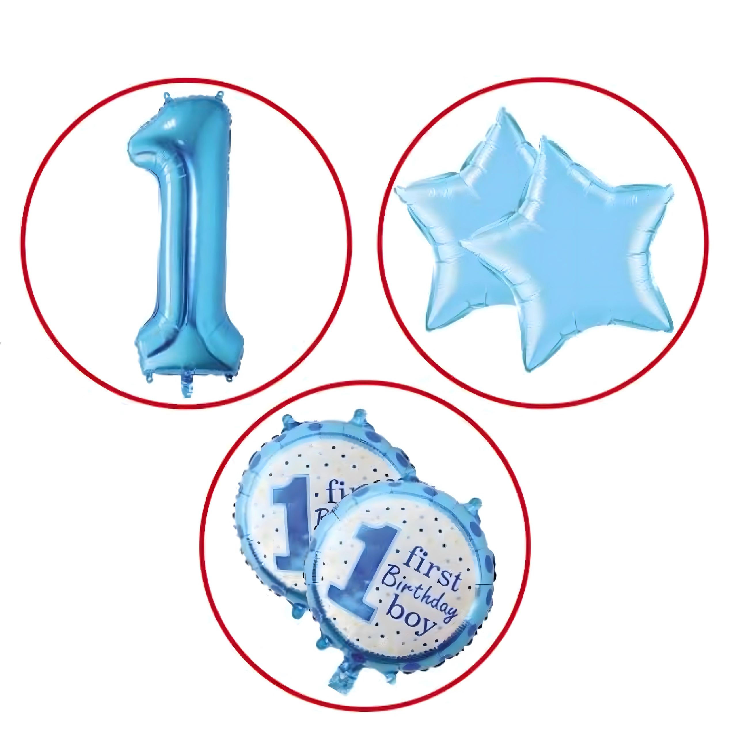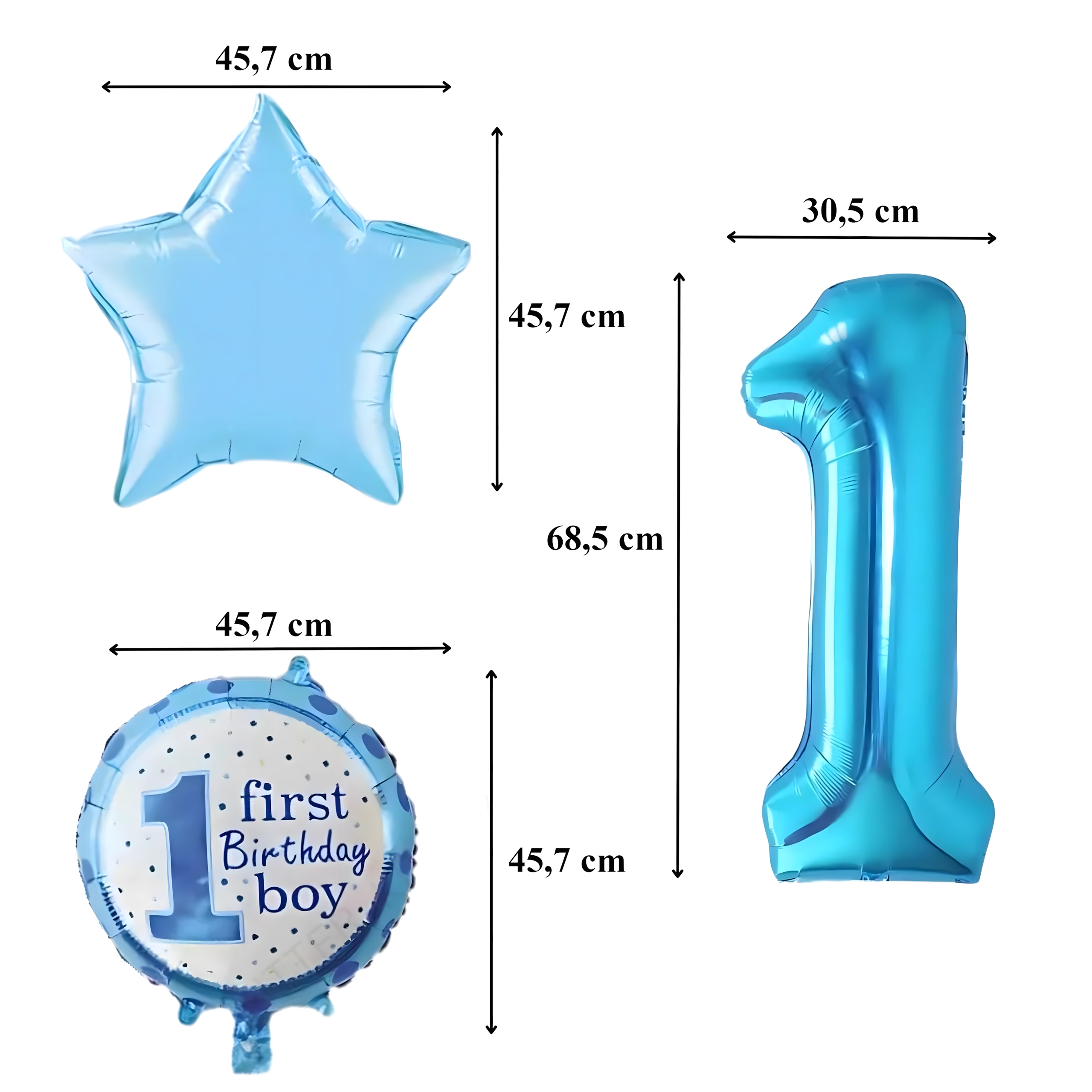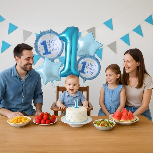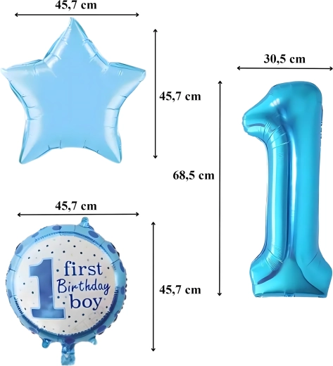 De ballonnen kunnen worden gevuld met lucht of helium (afhankelijk van het type). Kleuren en motieven zijn speciaal ontworpen voor de eerste verjaardag van een jongen.