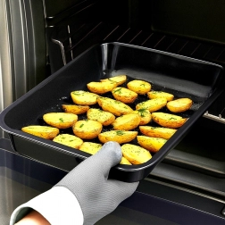 Dankzij de hoge randen is hij ideaal voor sappig vlees, ovenschotels, taarten met vulling en aardappelen – zonder risico op lekken. De universele afmeting past uitstekend in de meeste huishoudovens en biedt betrouwbare prestaties voor dagelijks bakken.