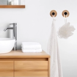 De set van 2 zelfklevende haken is een slimme oplossing voor overzichtelijke opslag van handdoeken, badjassen, doeken, tassen en accessoires. Natuurlijk bamboe in combinatie met zwart metaal creëert een tijdloze, minimalistische touch die past in moderne en Scandinavische interieurs. Montage zonder gereedschap bespaart tijd, muren en tegels.