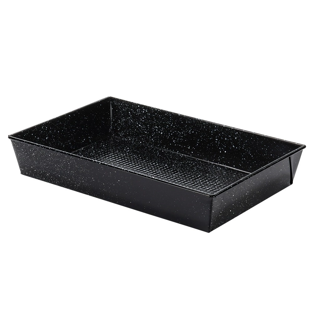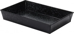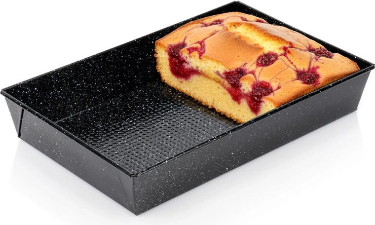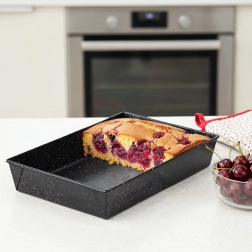 Praktische rechthoekige bakvorm van 36 × 24 × 6 cm van hoogwaardige koolstofstaal met een granieten, antiaanbak coating. Zorgt voor een gelijke warmtedistributie en gemakkelijk uitnemen van gerechten. Ideaal voor taarten, gehaktbrood, ovengerechten en groenten. Bestand tegen temperaturen tot 230 °C in gas- en elektrische ovens.