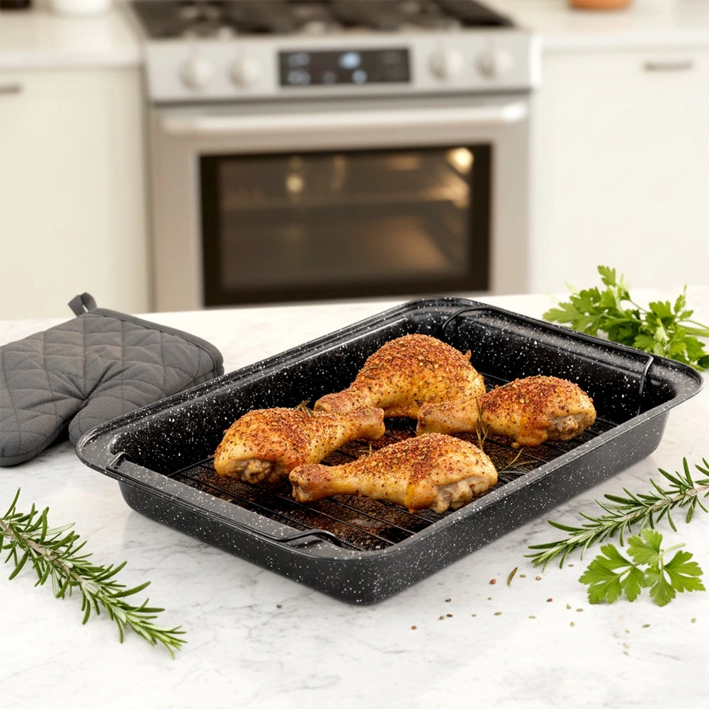Deze robuuste braadpan met afmetingen 37,5 × 25,5 × 5 cm is een uitstekende keuze voor dagelijks koken en feestelijk bakken. De antiaanbak granietcoating voorkomt aanbakken, zelfs met een minimale hoeveelheid vet, en maakt gezondere bereiding mogelijk. Het uitneembare metalen rooster houdt het vlees boven het braadvocht, zodat het aan alle kanten gelijkmatig gaart.