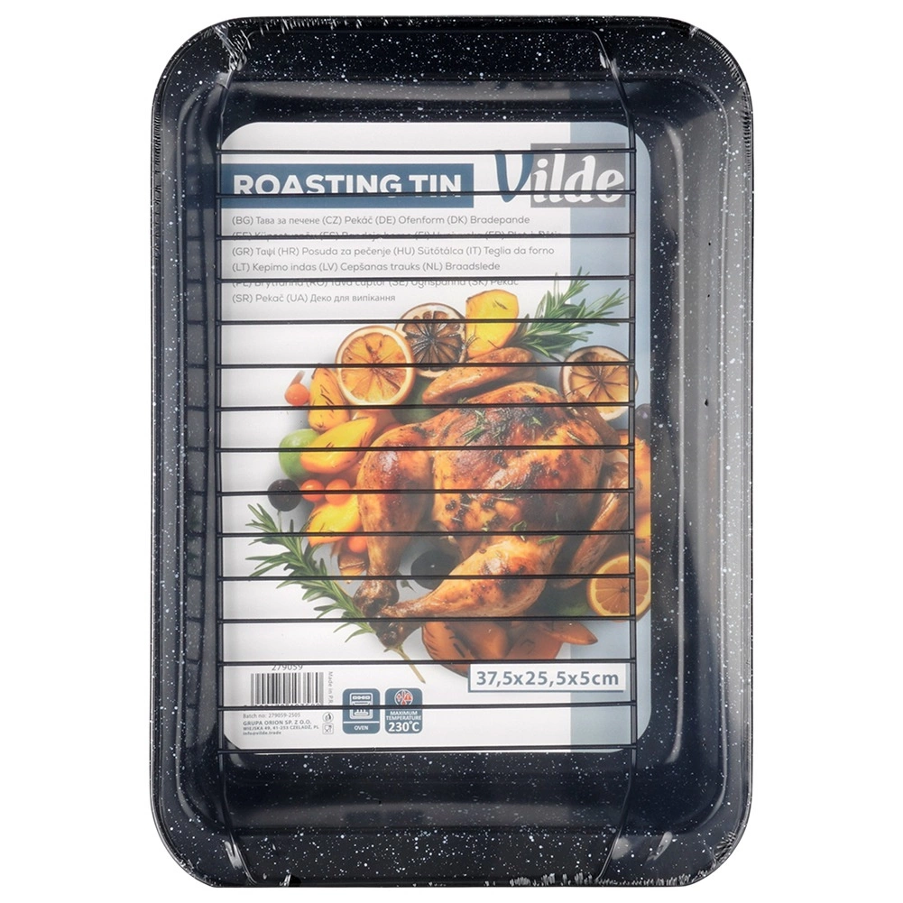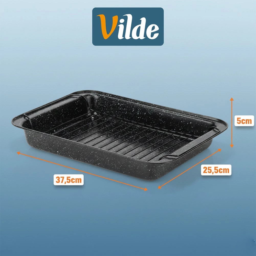 Hoogwaardig staal zorgt voor stabiliteit en een gelijkmatige warmteverdeling. Afmetingen 37,5 × 25,5 × 5 cm zijn ideaal voor het braden van vlees, gevogelte en ovengerechten.