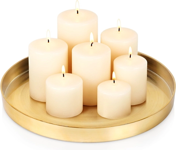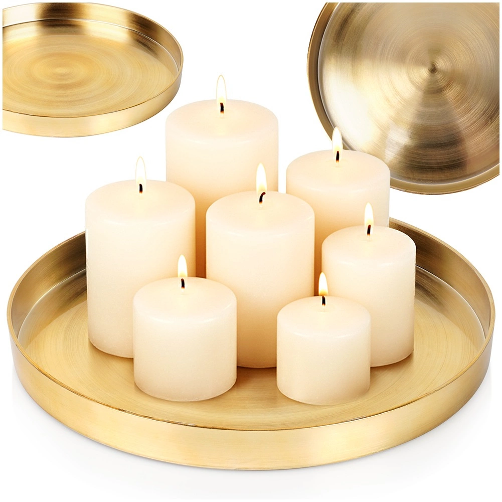 Elegante ronde schaal met een diameter van 32 cm met een moderne gouden afwerking en een verhoogde rand, ideaal voor het arrangeren van kaarsen, decoraties of sieraden. De stabiele constructie beschermt oppervlakken tegen was en helpt alles netjes op zijn plaats te houden.