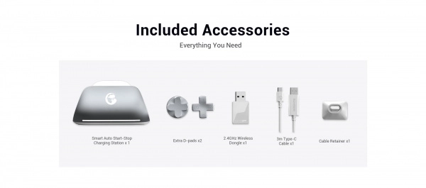 Met de GameSir Nexus-software stel je stickcurves, triggergevoeligheid, vibratie en macro’s fijn af. In de doos vind je ook een praktisch oplaadstation voor eenvoudig opladen en opbergen van de controller en de USB‑ontvanger.