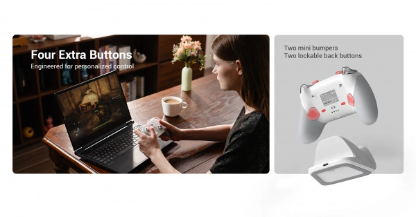 Voor competitief gamen zijn er optische microschakelaars voor ABXY, een precieze mechanische D‑pad, een paar R5/L5‑minibumpers en twee programmeerbare achterknoppen R4/L4 met vergrendeling tegen onbedoelde inputs. Vier vibratiemotoren in de triggers en grips zorgen voor meeslepende haptiek en de verwisselbare magnetische driedelige cover maakt personalisatie mogelijk.