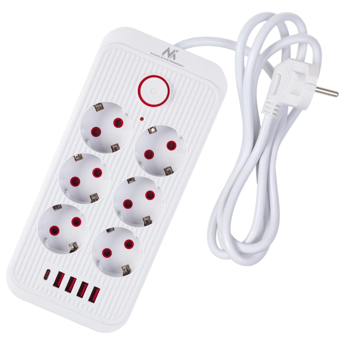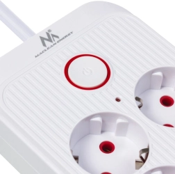 De geïntegreerde knop met indicatie laat je alle aangesloten apparaten met één druk in‑ of uitschakelen. Kindersluitingen beschermen tegen toevallig contact.