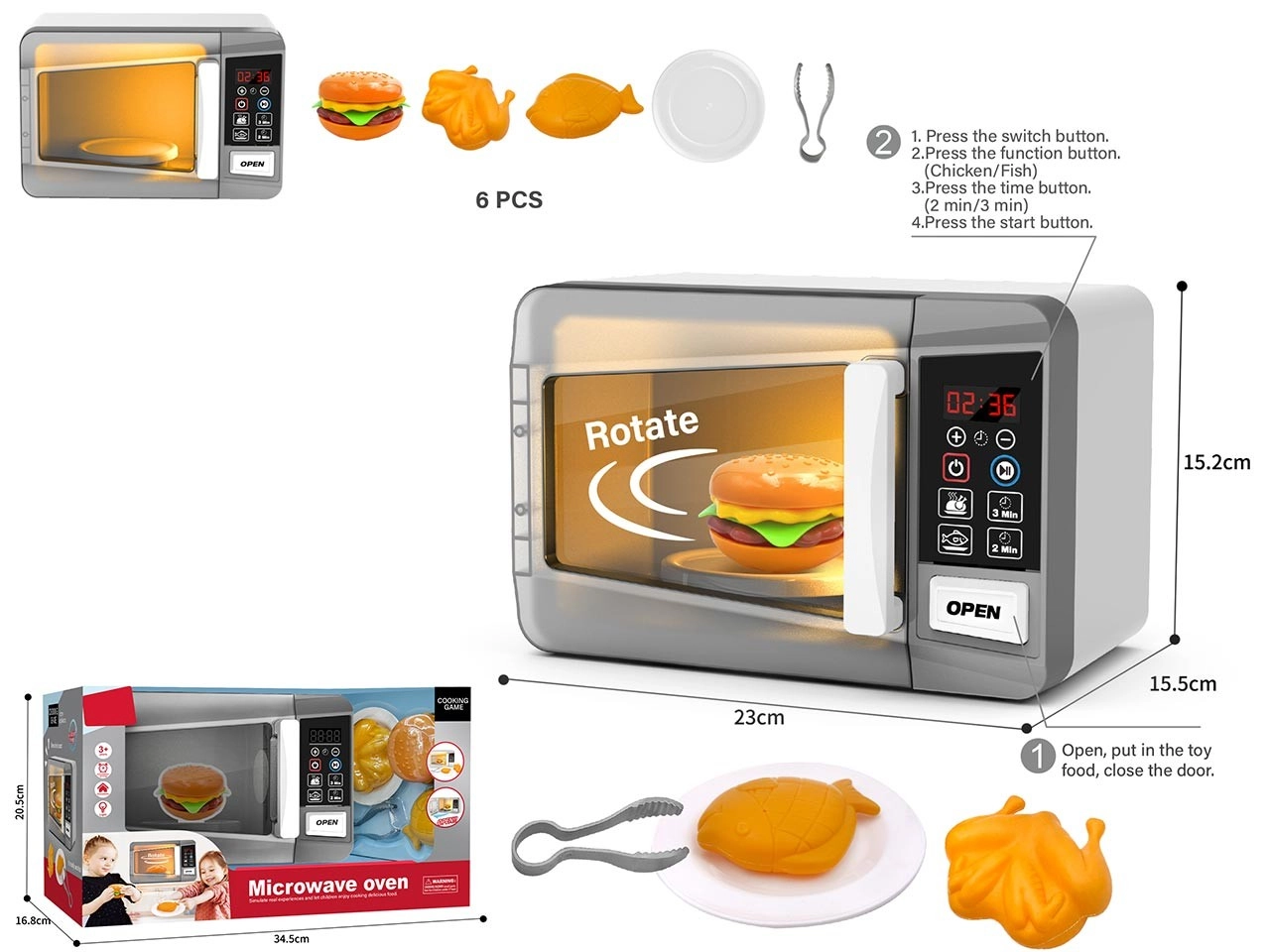Deze kinder-magnetron biedt kinderen een authentieke kookbeleving. Na het indrukken van de START-knop gaat het licht aan, begint het plateau te draaien en hoor je geluidseffecten die het echte gebruik nabootsen.