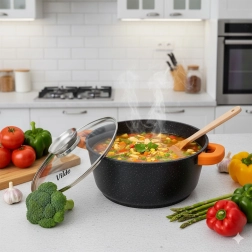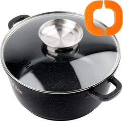 Twee robuuste zijhandgrepen met siliconen hoezen bieden zekerheid en comfort bij het dragen, zelfs wanneer de pan heet is. Dankzij de universele toepassing is hij ideaal voor soepen, stoven, goulash, ovengerechten en one-pot-maaltijden – en je kunt er direct stijlvol mee aan tafel serveren.