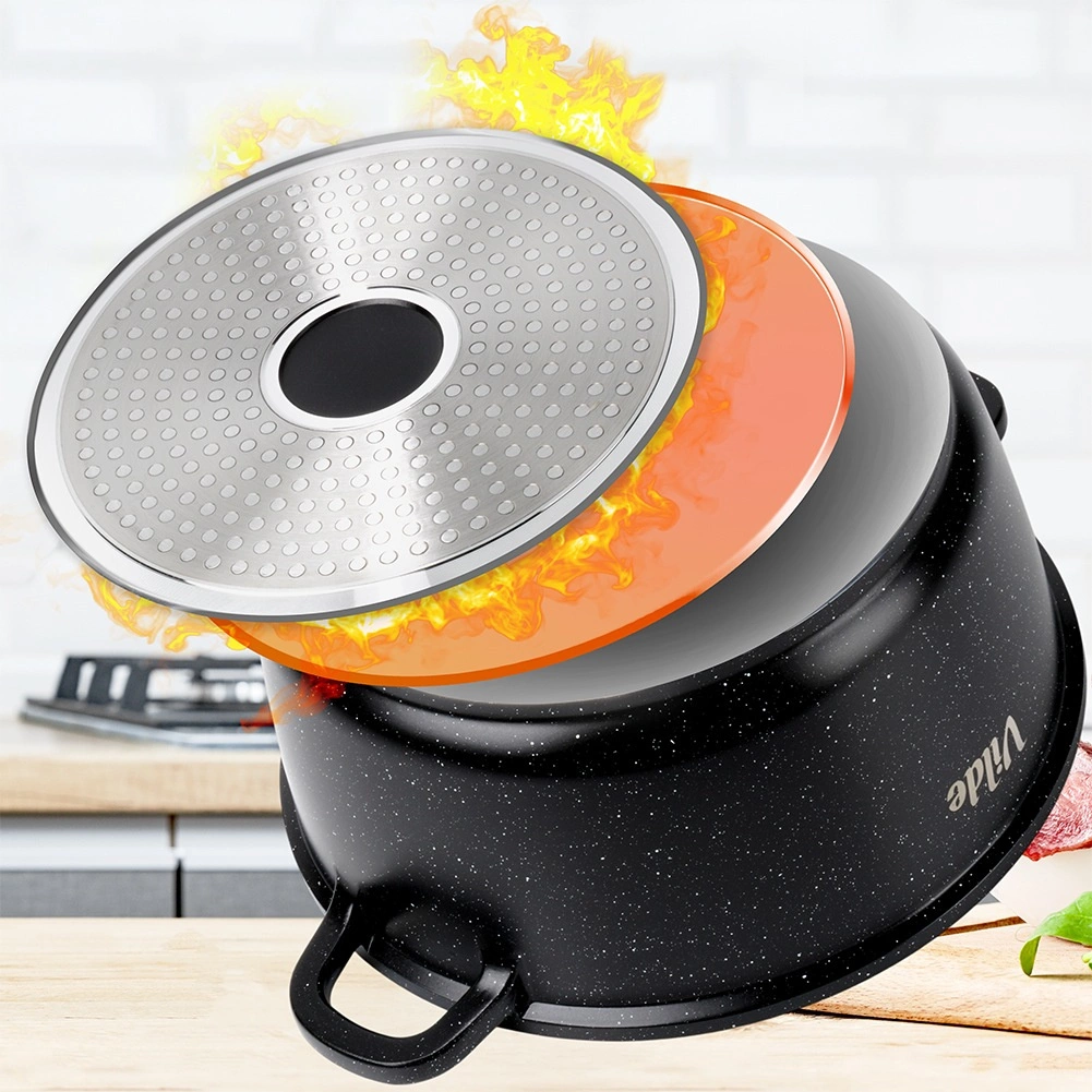 De meerlagige bodem met inductieplaat zorgt voor een snelle en gelijkmatige warmteverdeling. Geschikt voor gas, elektrisch, keramisch en inductie.