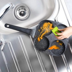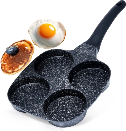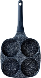 Praktische granieten koekenpan met vier ronde vormen met een diameter van 8,5 cm voor perfect gevormde eieren en pannenkoekjes. Dankzij de antiaanbak granietcoating bereid je gerechten met een minimum aan vet, de egale warmteverdeling zorgt voor gelijkmatig bakken en de ergonomische handgreep garandeert veilig en comfortabel gebruik. Geschikt voor alle soorten kookplaten, inclusief inductie, en eenvoudig te reinigen.