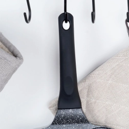 Het massieve aluminium lichaam zorgt voor een snelle opwarming en een gelijke warmteverdeling over het hele oppervlak, wat tijd en energie bespaart. De ergonomische, antislip handgreep ligt prettig in de hand en de opening aan het uiteinde maakt praktisch ophangen mogelijk.
