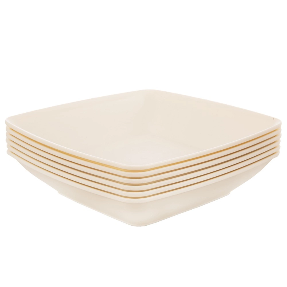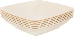 Praktische set van 6 diepe borden in een modern vierkant design voor dagelijks gebruik, thuis en buiten. De borden met afmetingen 17,5 × 17,5 × 4,7 cm en een inhoud van 500 ml zijn licht, duurzaam en makkelijk te onderhouden. Geschikt voor in de magnetron en de vaatwasser, ideaal voor soepen, pasta, salades en eenpansgerechten. Het hoogwaardige materiaal in crèmekleur biedt slag- en barstbestendigheid.