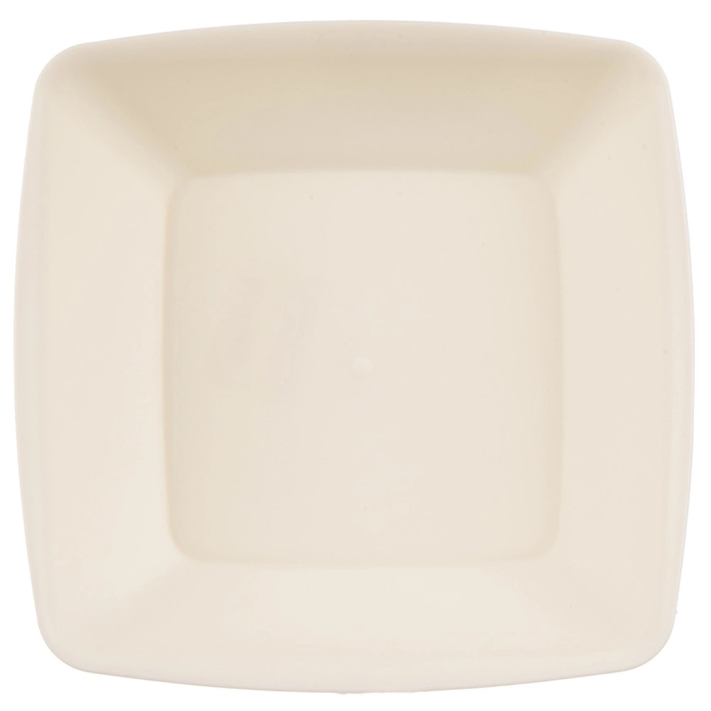 Vierkante diepe borden in crèmekleur zijn eenvoudig stapelbaar, besparen ruimte en zijn bestand tegen stoten en vallen.