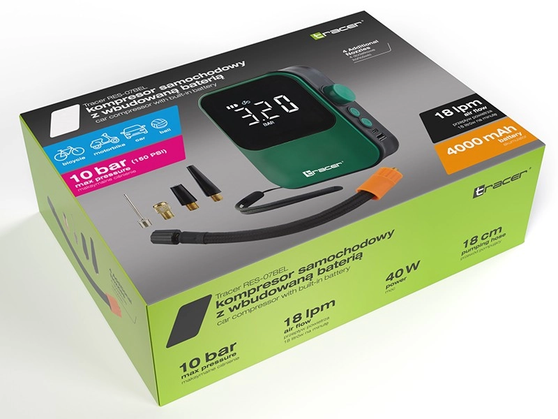 Op zoek naar een betrouwbare compressor voor onderweg? De TRACER-compressor combineert hoge prestaties, eenvoudige bediening en praktische functies in één compact apparaat. Dankzij de max. druk van 10 bar en het debiet van 18 l/min pomp je snel autobanden of fietsbanden, sportuitrusting en opblaasbare accessoires bij.