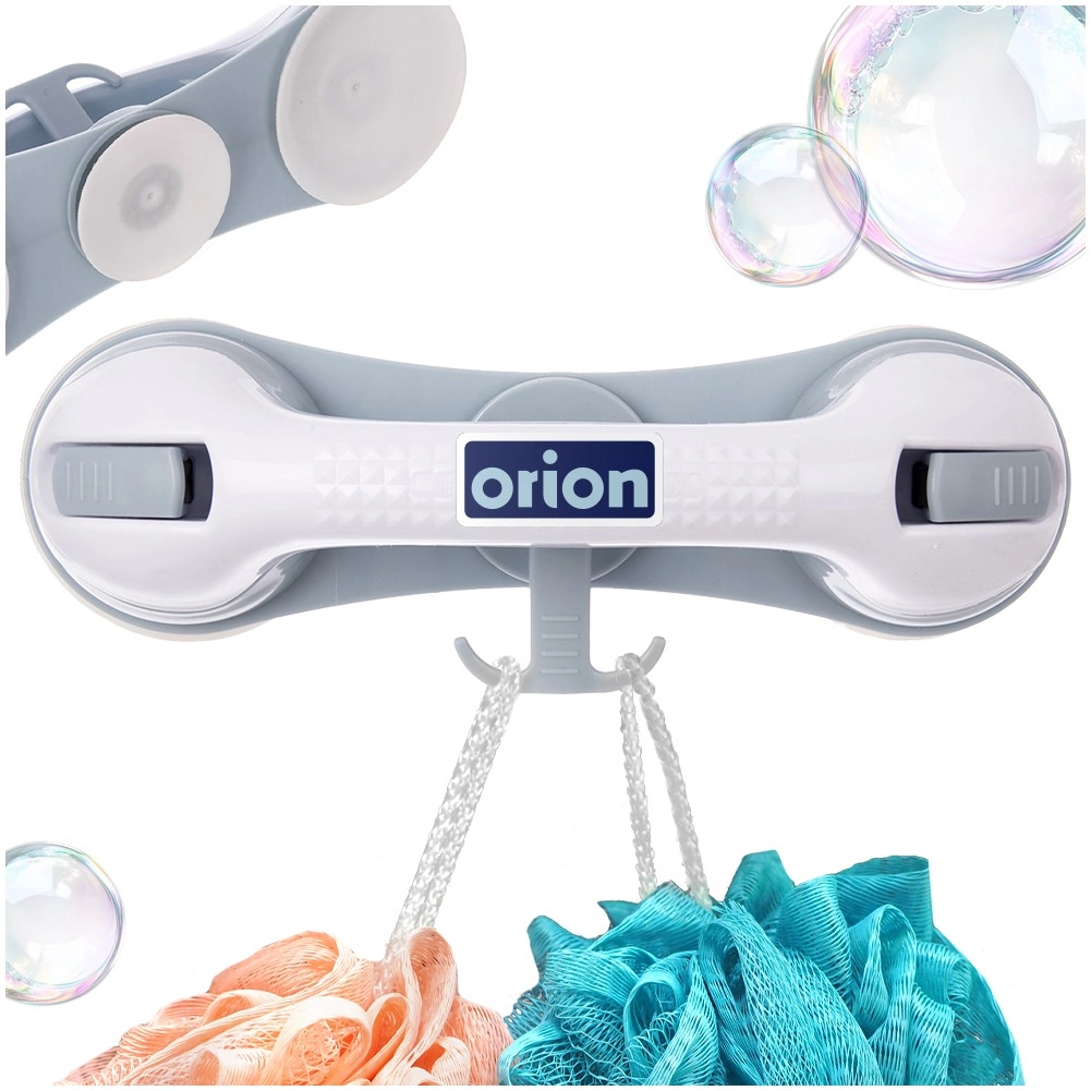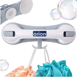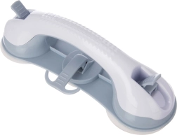 Praktische badkamerhandgreep met zuignappen voor extra veiligheid en stabiliteit onder de douche, bij het bad of het toilet. Montage zonder boren, drie sterke zuignappen, ergonomische greep en een praktische haak voor accessoires. Stevige en duurzame constructie van hoogwaardige, vochtbestendige kunststof. Snelle installatie op gladde, ontvet­te oppervlakken en de mogelijkheid om de greep op elk moment te verwijderen zonder de tegels te beschadigen.
