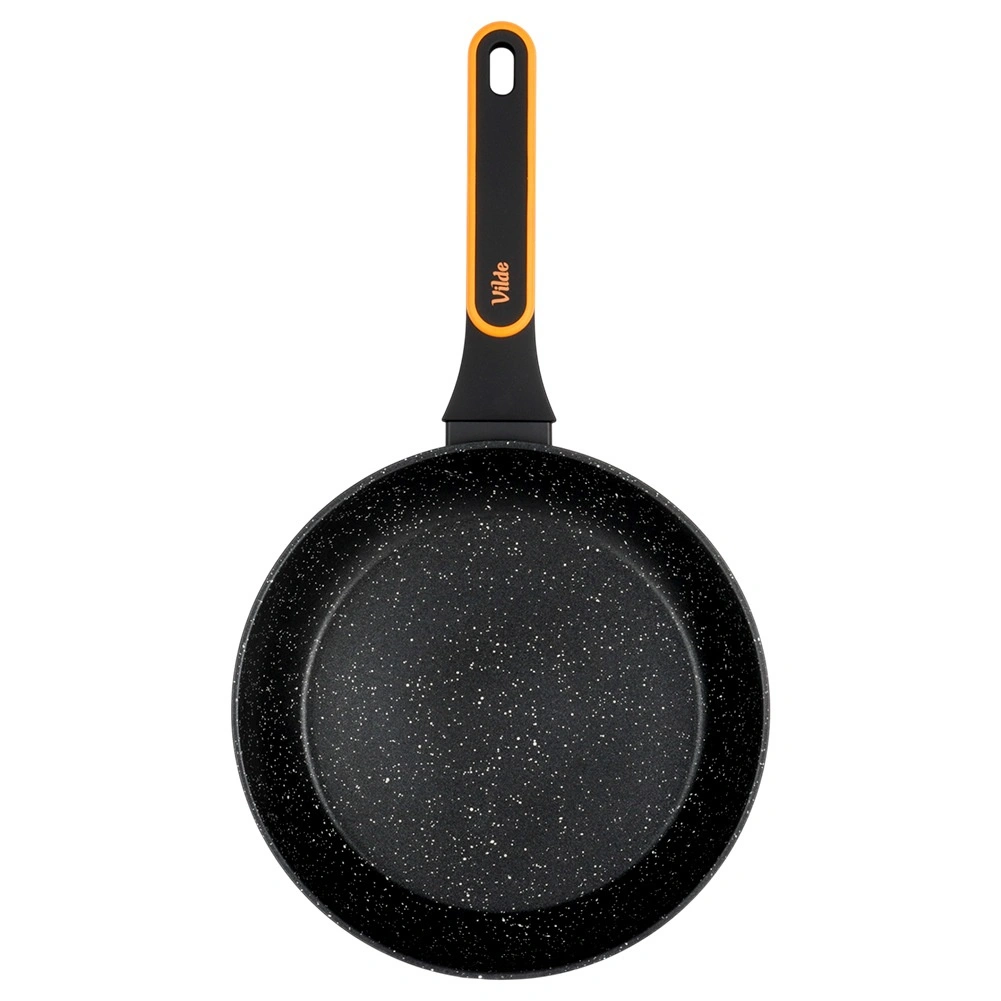 Deze granieten pan van gegoten aluminium combineert duurzaamheid, een elegante uitstraling en uitstekende gebruikseigenschappen. De anti-aanbak granieten laag minimaliseert het gebruik van olie en vereenvoudigt het reinigen, terwijl de meerlaagse bodem zorgt voor snelle en zuinige verhitting. De moderne ergonomische handgreep met antislipafwerking wordt tijdens het koken niet heet en ligt veilig in de hand.