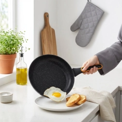 Ontdek de duurzame pan uit de TERRUNA-lijn, die modern design en eersteklas functionaliteit combineert. De antiaanbak granietlaag maakt koken met weinig olie mogelijk, is gemakkelijk schoon te maken en is ideaal voor bakken en stoven van vlees, groenten of eieren.