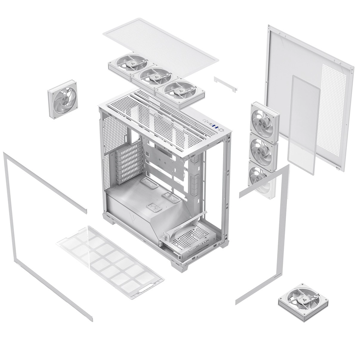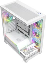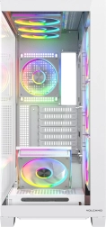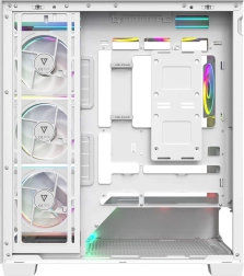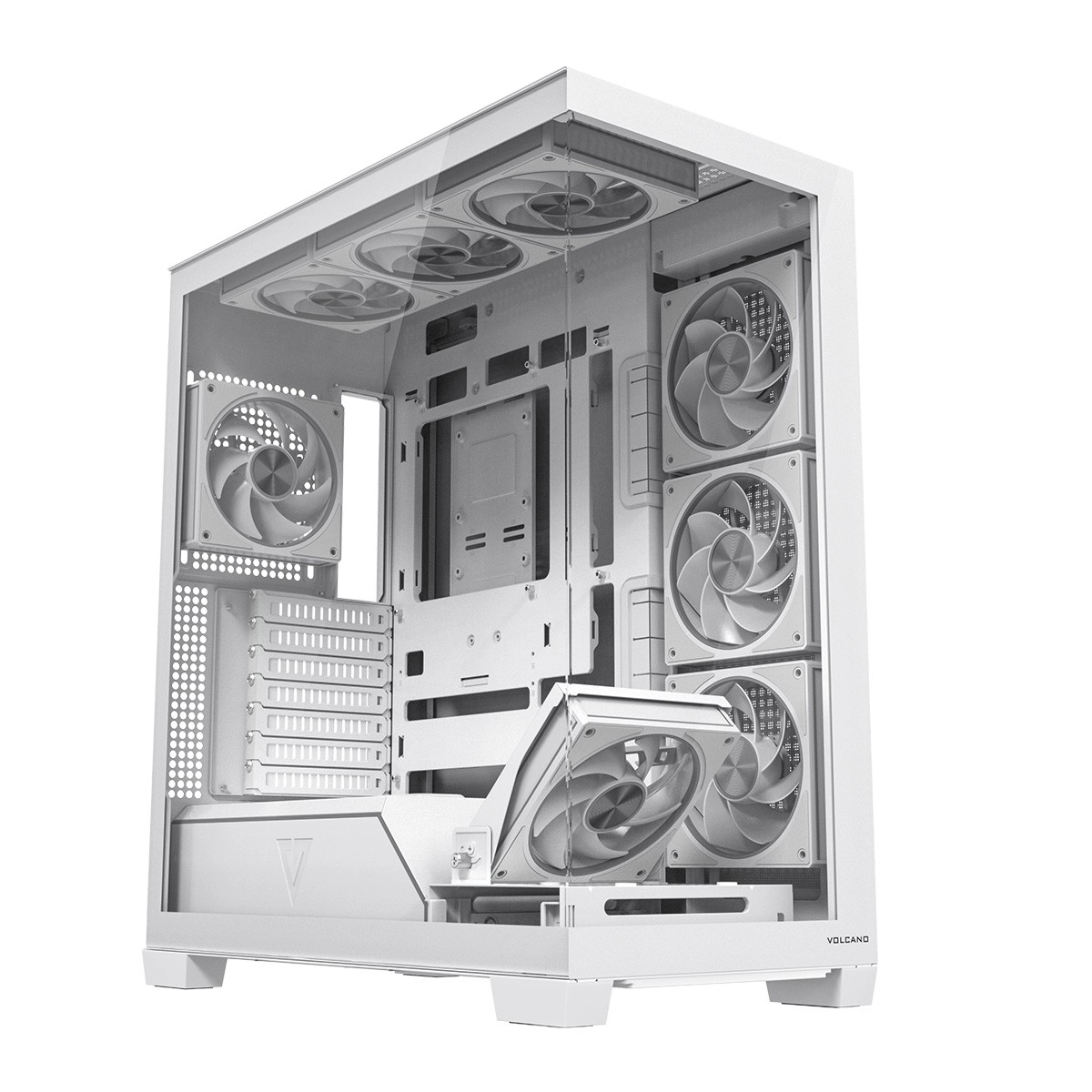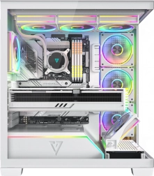 De Volcano Stellar Plus ARGB combineert een aantrekkelijke “aquarium”-stijl met uitstekende airflow. Acht PWM ARGB‑ventilatoren, inclusief drie met omgekeerde bladen en een verstelbaar zijframe voor directe koeling van de GPU, houden de temperaturen in toom tijdens lange gamesessies. Gehard glas aan de zijkant en voorkant zet je componenten fraai in de kijker, terwijl de ARGB‑LED‑strip op de PSU‑shroud zorgt voor een visueel “wow”-effect.