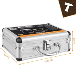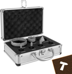 Dankzij de M14-draad kunnen de kronen op een haakse slijper worden gebruikt; met de meegeleverde adapter ook in een standaard boormachine. De conische frees 2–50 mm vergemakkelijkt het afkanten, kalibreren en precies vergroten van gaten. Alles is overzichtelijk opgeborgen in een stevige aluminium transportkoffer met schuimvulling voor veilig vervoer.
