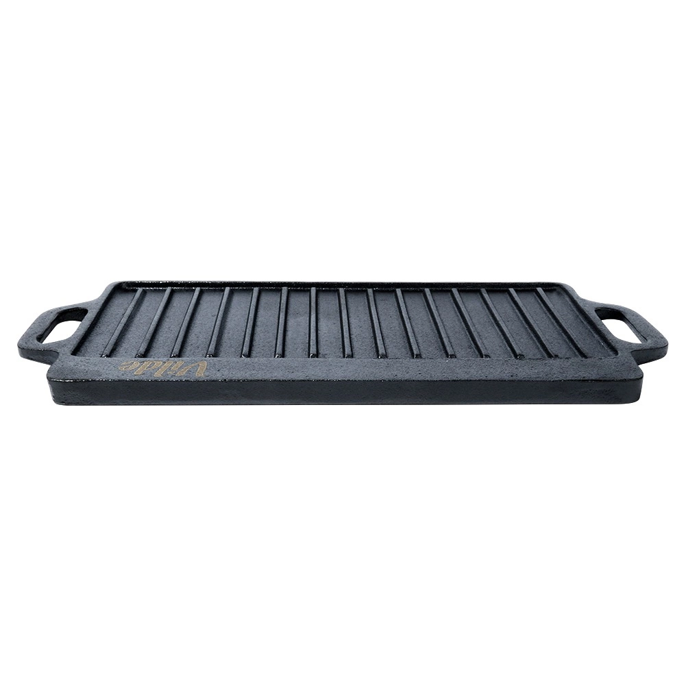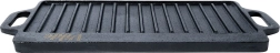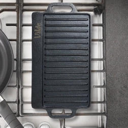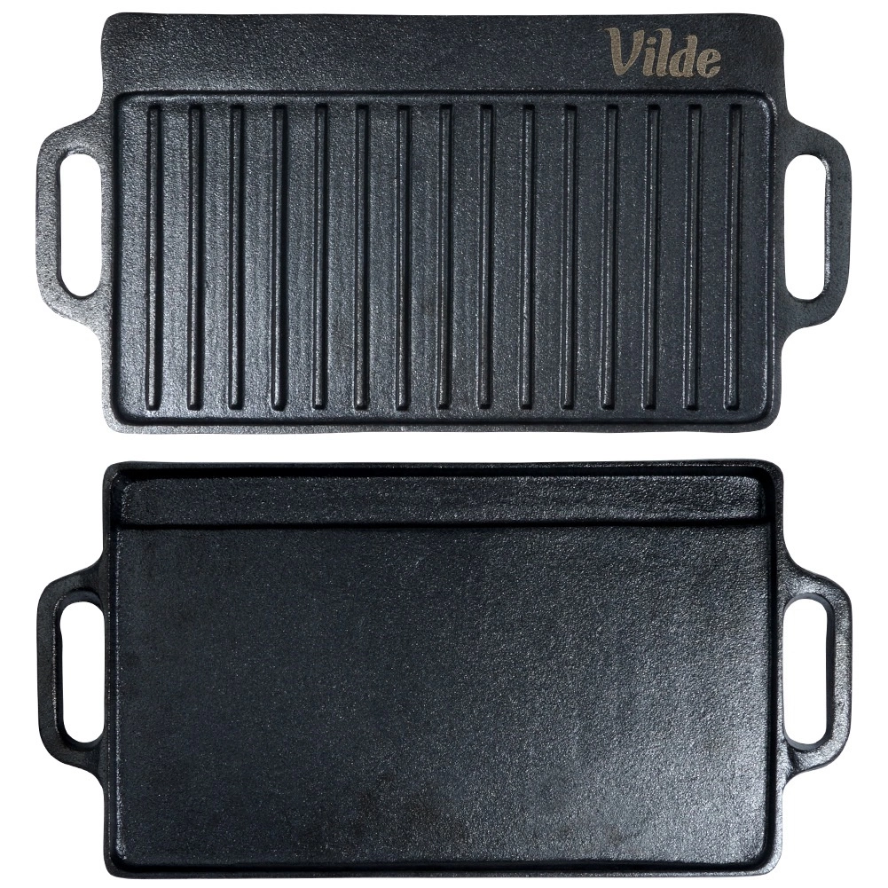 Dubbelzijdige gietijzeren grillplaat van 40 × 20,5 cm voor perfecte steaks, vis en groenten. Dankzij het massieve materiaal accumuleert ze warmte uitstekend, verdeelt die gelijkmatig en zorgt voor een opvallend grillraster op gegrilde gerechten. De ene kant is vlak voor bakken en aanbraden, de andere geribbeld voor grillen met vetafvoer. Geschikt voor fornuis, oven en barbecue.