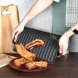 De plaat is universeel: werkt in de oven, op gas-, elektrische, keramische en halogeenkookplaten en direct op het rooster van de barbecue. Het vlakke oppervlak is perfect voor eieren, pannenkoeken, groenten of vis; de geribbelde zijde creëert karakteristieke strepen op steaks, worstjes en kazen.