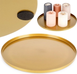 Een elegant rond dienblad met een diameter van 30 cm, ideaal als stijlvolle basis voor kaarsen, decoraties of sieraden. Dankzij de metalen constructie met een matte gouden afwerking is het duurzaam, stabiel en gemakkelijk schoon te maken. Antislip en beschermende pads aan de onderzijde beschermen meubels en de lage rand helpt alles veilig op zijn plaats te houden.