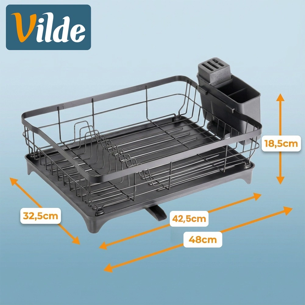 De geïntegreerde schenktuit in de bak zorgt voor een gecontroleerde afvoer van water rechtstreeks naar de gootsteen, zodat het werkblad vrij blijft van natte plekken. Het afdruiprek past in elke keuken – van modern tot klassiek – en dankzij het eenvoudige onderhoud bespaart het elke dag tijd. Origineel product van het merk VILDE, vervaardigd volgens Europese normen.