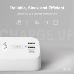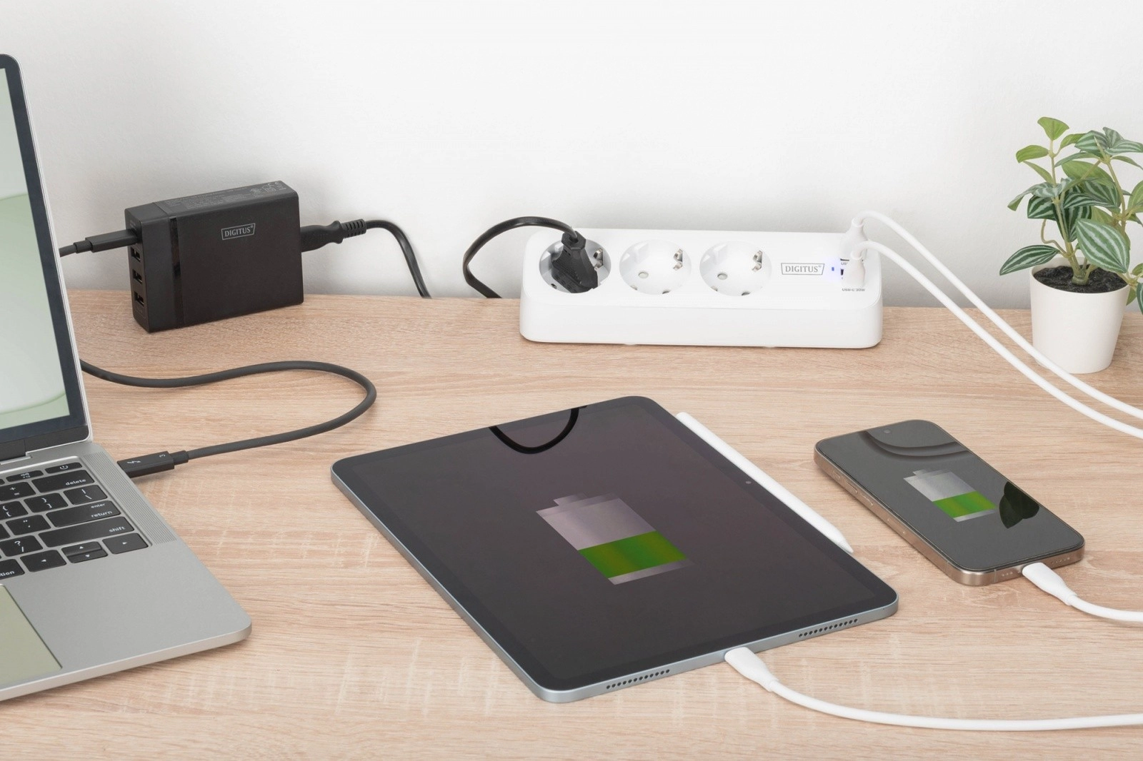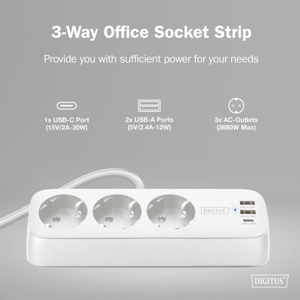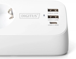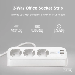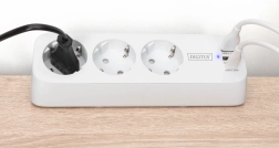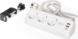 Deze witte tafel-voedingsstrip met stevige klem brengt orde en gemak naar elk werkblad. Drie Schuko-contacten onder 45° zorgen voor probleemloze aansluiting, ook van grotere voedingen, terwijl de USB‑poorten snel opladen van telefoon, oordopjes of tablet mogelijk maken zonder aparte lader.