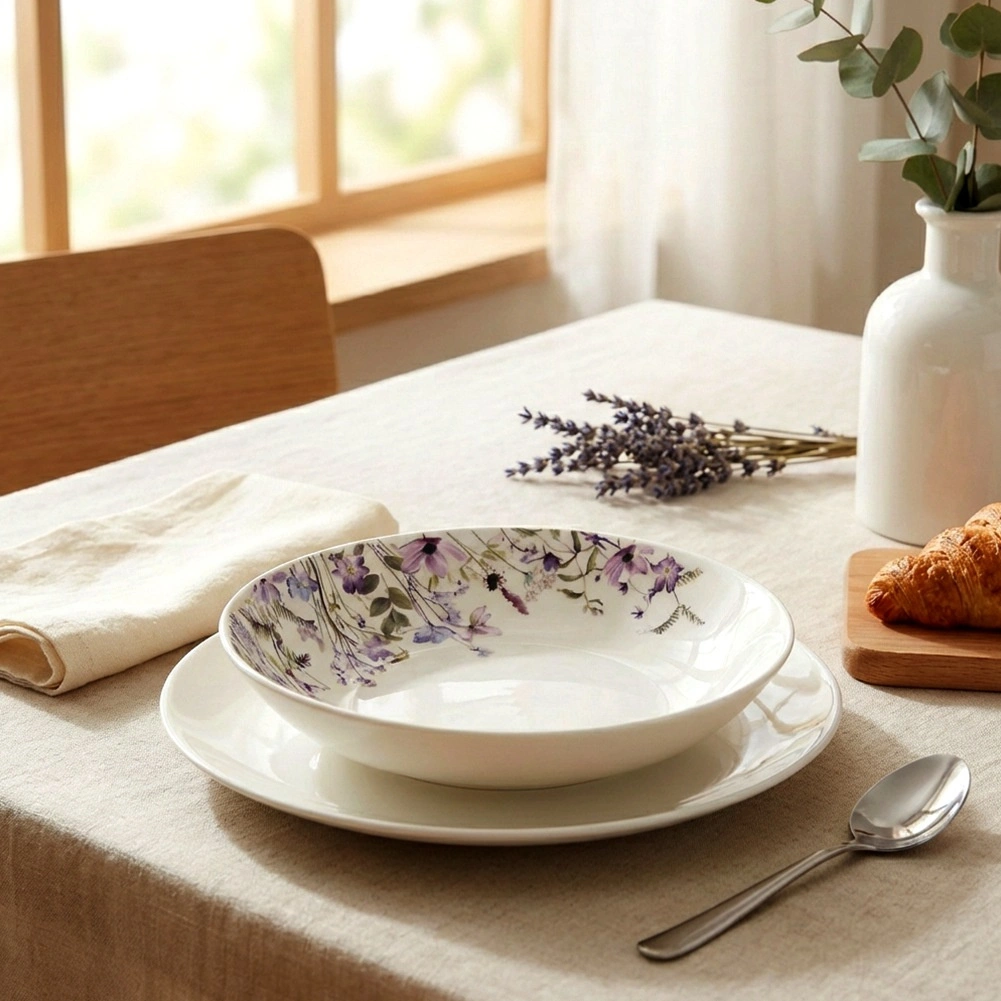 Elegant diep porseleinen bord met een decoratief veldbloemenpatroon, ideaal voor dagelijks gebruik en feestelijke gelegenheden. Met een diameter van 20,5 cm en een inhoud van 600 ml is het perfect voor soepen, pasta en salades. Porselein garandeert een lange levensduur; het bord is geschikt voor vaatwasser en magnetron en siert elke tafel met zijn elegante design.