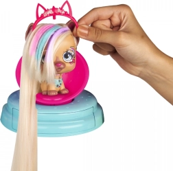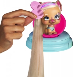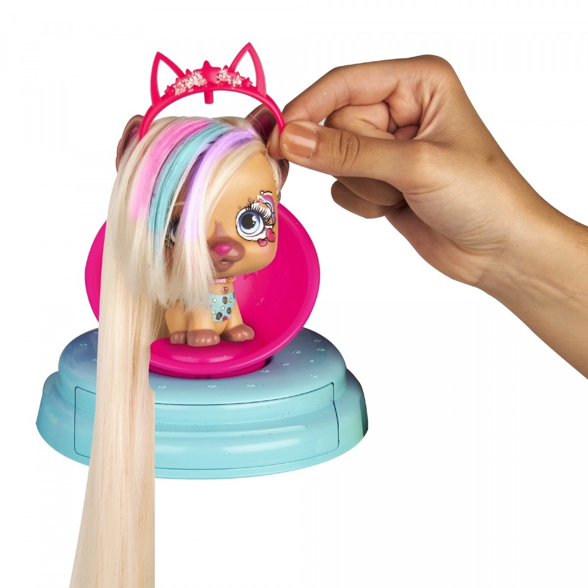 De VIP Pets salon brengt de sfeer van de populaire serie rechtstreeks naar de kinderkamer. De hoofdrol is voor hondje Kiara met platinablond, 30 cm lang haar, dat je kunt wassen, kleuren, kammen, vlechten en versieren. Dankzij de functionele kapperswasbak maak je het haar gemakkelijk vochtig en met de regenboogkam tover je kleurrijke lokken. In de glittercapsule geef je het kapsel een betoverend glinstereffect.