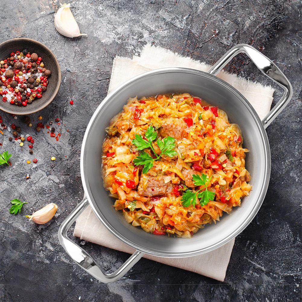 De aluminium kern in de meerlagige bodem verdeelt de warmte snel en gelijkmatig, zodat gerechten niet aanbranden en efficiënt garen.