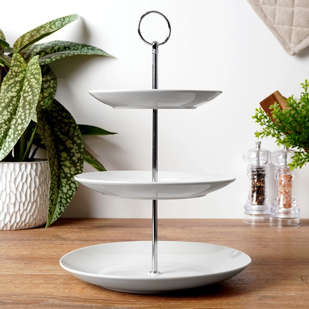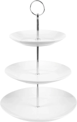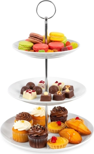 Elegante porseleinen etagère met drie lagen met een hoogte van 34 cm is ideaal voor stijlvol serveren van desserts, gebak, fruit en hartige hapjes. Drie lagen met verschillende diameters besparen ruimte op tafel, een metalen handgreep maakt dragen eenvoudig en de stabiele constructie zorgt voor veilig gebruik thuis en in de horeca.