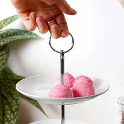 De centrale metalen staaf met praktische ring zorgt voor veilig en comfortabel verplaatsen van de hele etagère tussen serveerplekken.